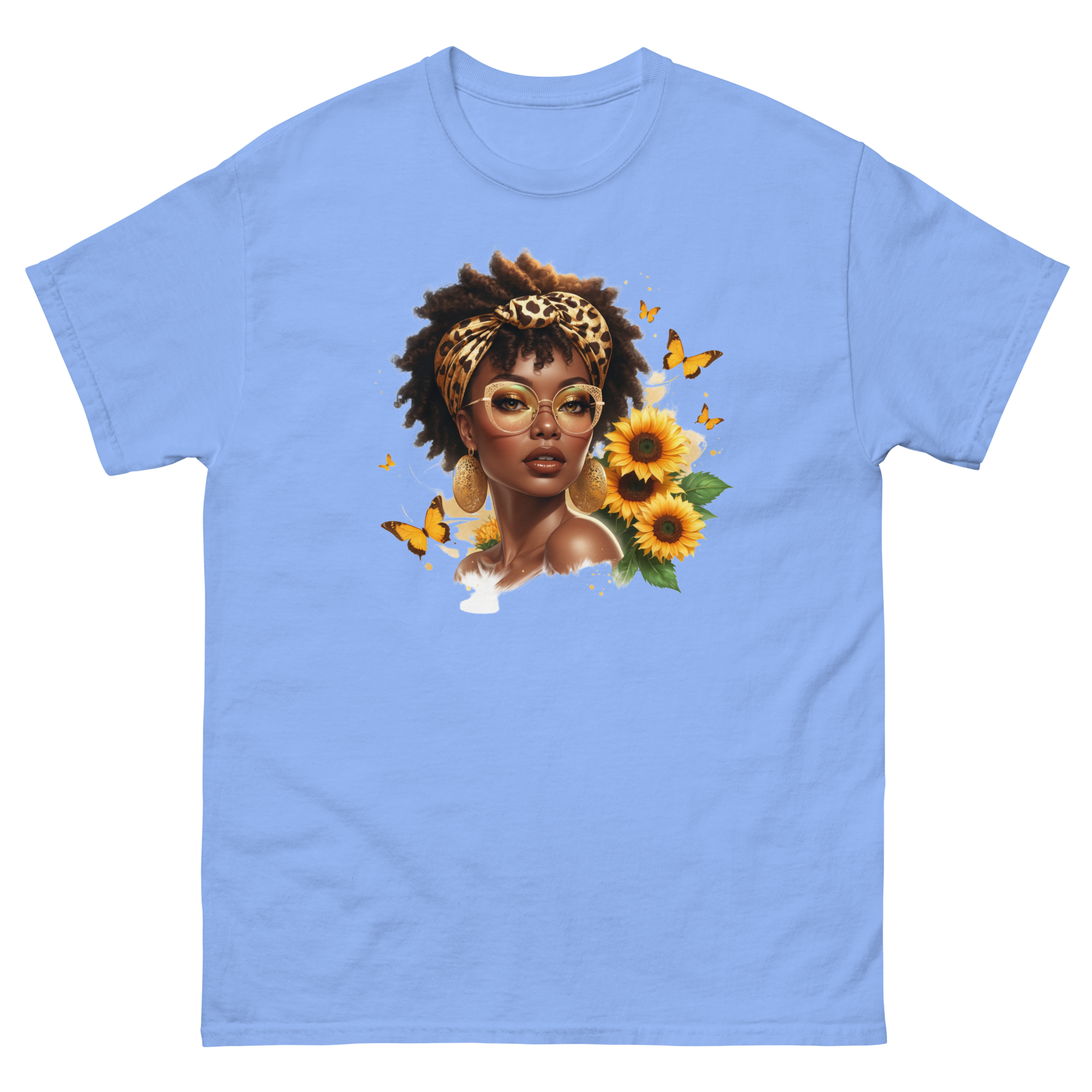 🌻 Bring fierce, radiant energy to your wardrobe with our Afro Chic Sunflower T-Shirt! Featuring a stunning afro-curly beauty with a bold leopard print headwrap, golden glasses, vibrant sunflowers, and fluttering butterflies, this graphic tee celebrates confidence, empowerment, and natural beauty. Perfect for making a statement with style every day! ✨