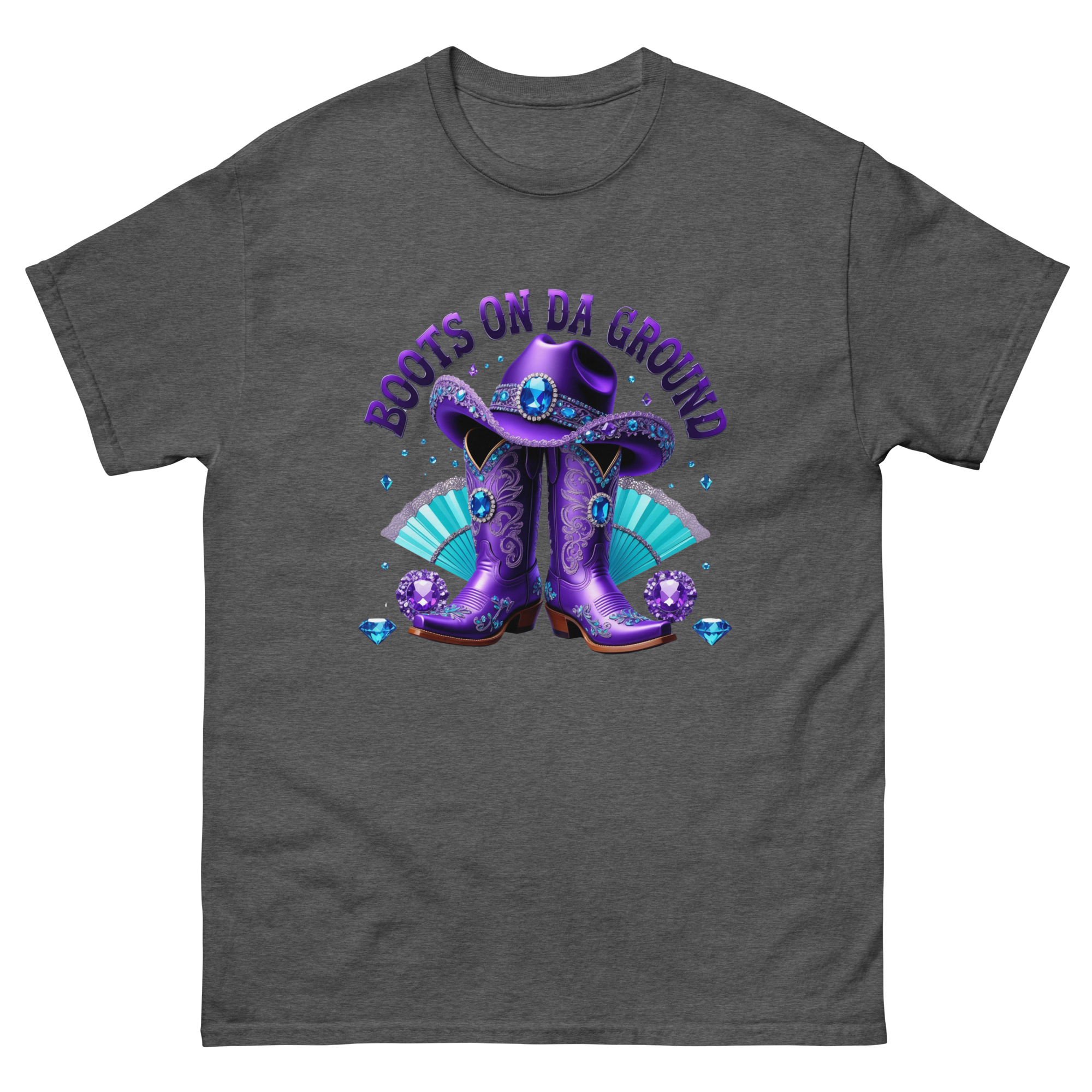 Turn heads and leave your mark—these “Boots on Da Ground” #1 tees are made for those who walk bold, shine brighter, and live life on their own terms. Whether you're rocking these at a rodeo, brunch, or your everyday hustle, this tee brings major western energy with luxe jewel tones, rich purples, and unapologetic flair.