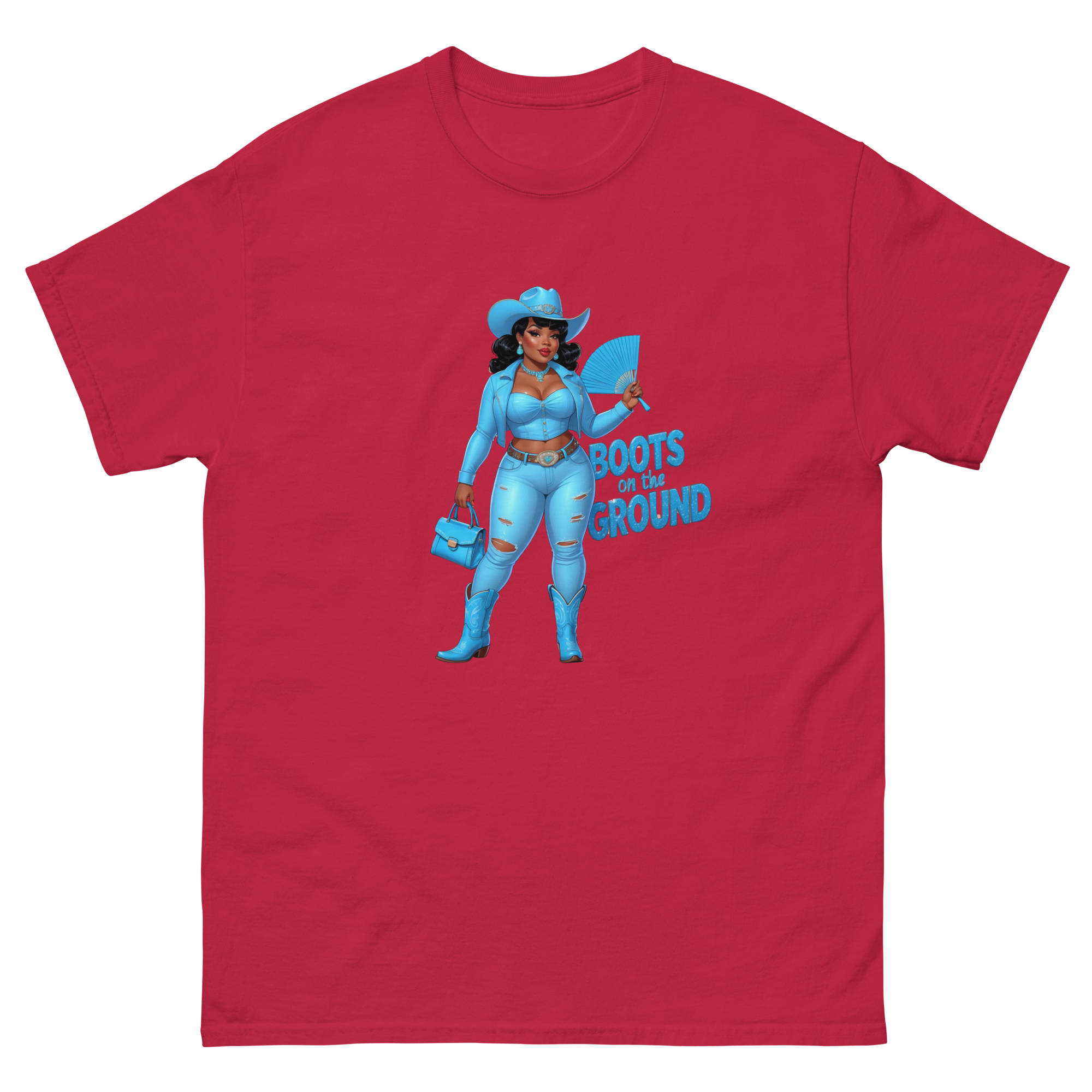Put some power behind your style with this Boots on the Ground #2 tee featuring a confident, thick curvy cowgirl styled in a full light blue Western fit. From her rhinestone boots to her matching fan, hat, and handbag, this character doesn’t just show up—she takes over the room.