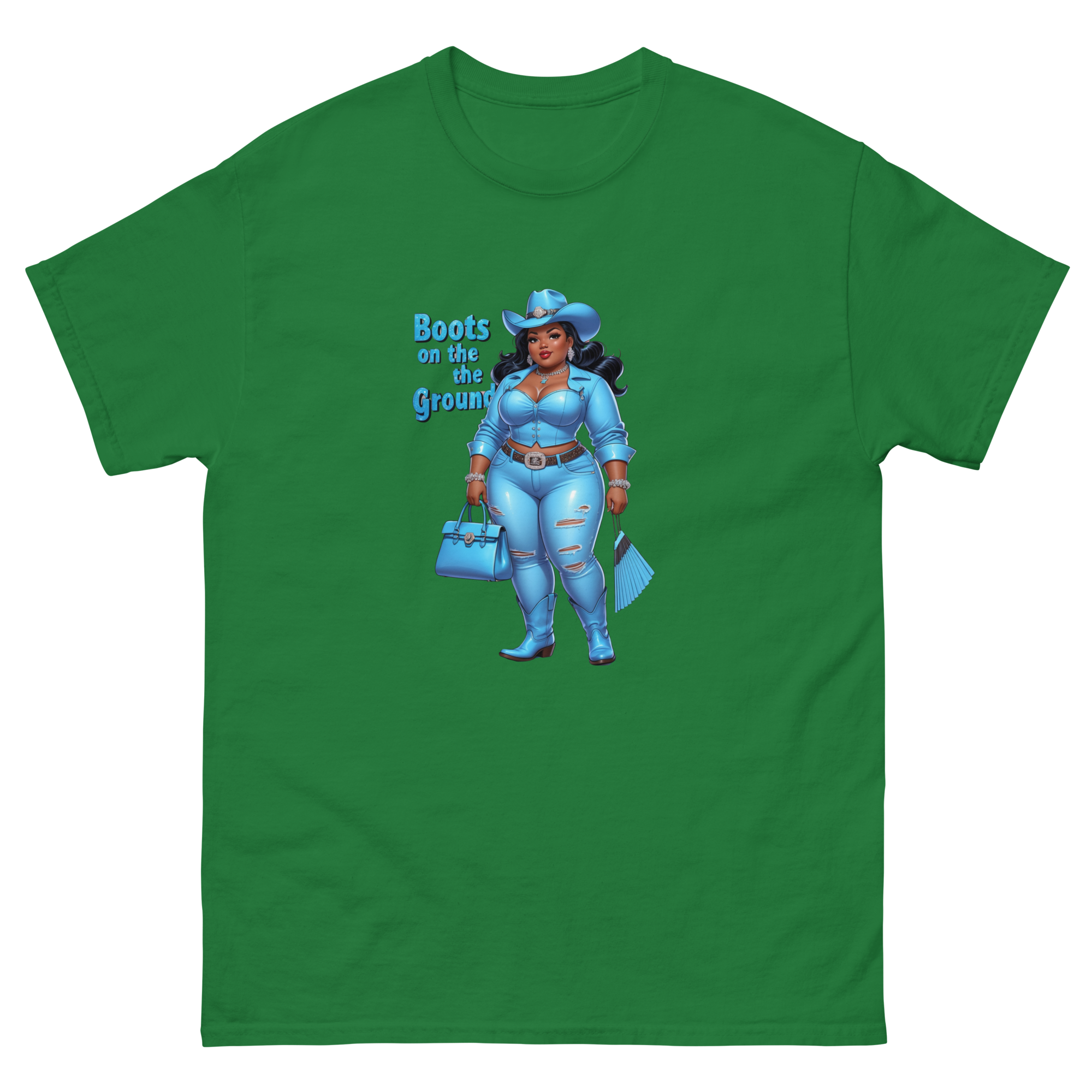 Put some power behind your style with this Boots on the Ground #3 tee featuring a confident, thick curvy cowgirl styled in a full light blue Western fit. From her rhinestone boots to her matching fan, hat, and handbag, this character doesn’t just show up—she takes over the room.