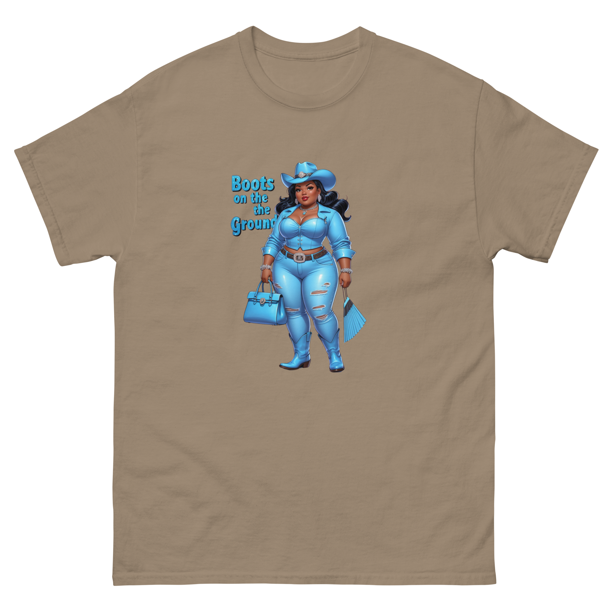 Put some power behind your style with this Boots on the Ground #3 tee featuring a confident, thick curvy cowgirl styled in a full light blue Western fit. From her rhinestone boots to her matching fan, hat, and handbag, this character doesn’t just show up—she takes over the room.
