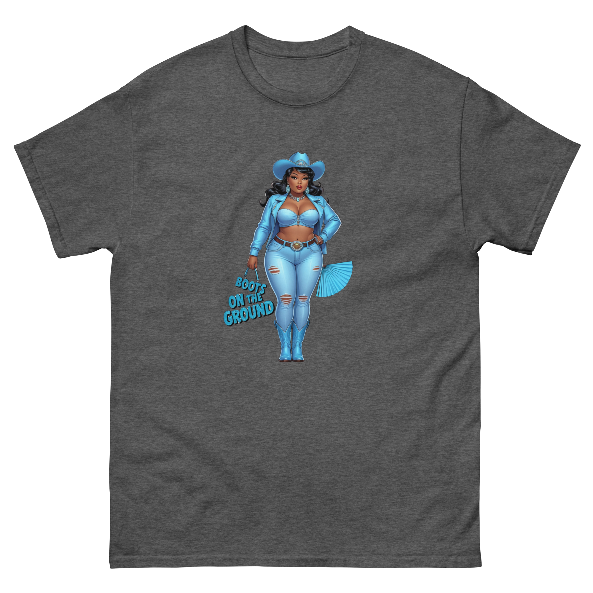 Put some power behind your style with this Boots on the Ground #4 tee featuring a confident, thick curvy cowgirl styled in a full light blue Western fit. From her rhinestone boots to her matching fan, hat, and handbag, this character doesn’t just show up—she takes over the room.