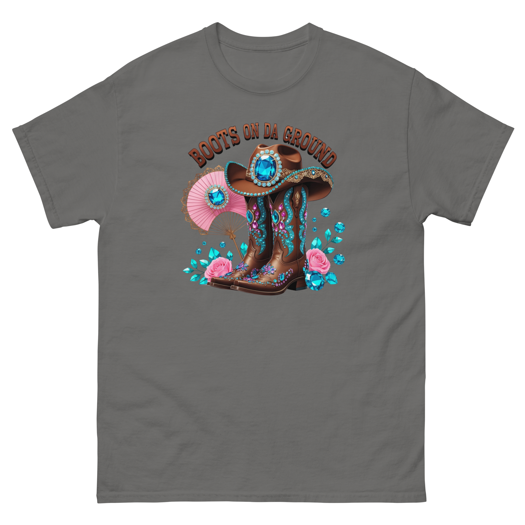Put your bold side on full display with this stunning “Boots on Da Ground” graphic tee. Featuring richly detailed brown rhinestone boots, jeweled accents, and turquoise floral flair, this design adds instant attitude to any wardrobe.