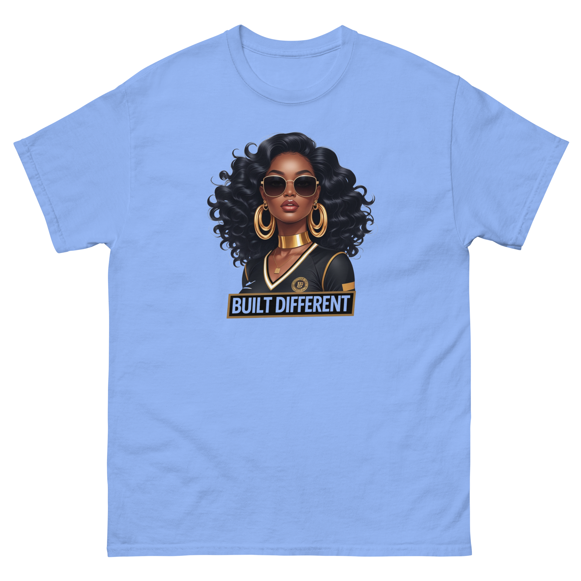 Command the spotlight. The “Built Different” tee celebrates boldness, self-worth, and unshakable style. Featuring a stunning digital illustration of a confident Black beauty in gold hoops, luxe accessories, and jet-black curls, this design was made for those who walk in power.