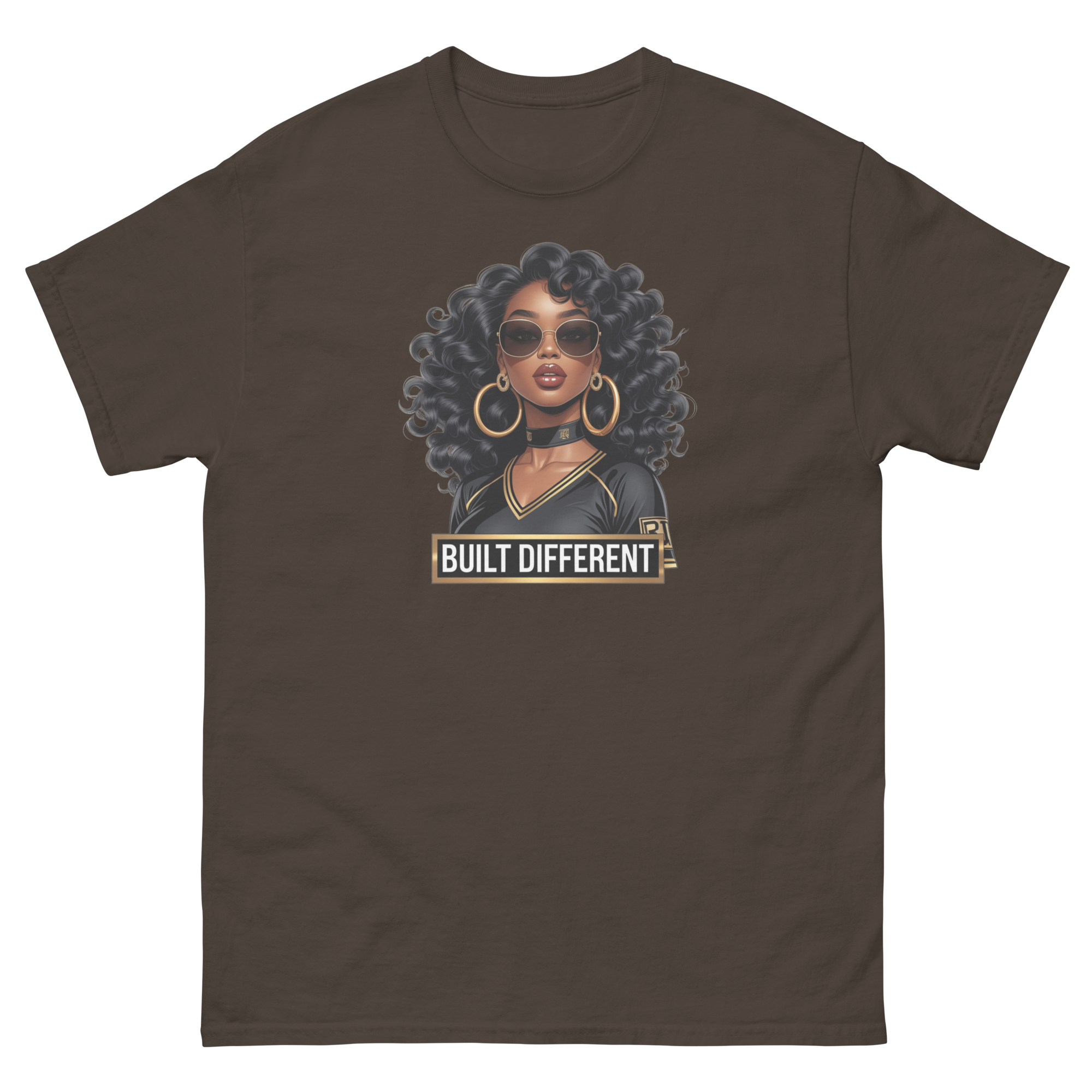 Command the spotlight. The “Built Different” tee celebrates boldness, self-worth, and unshakable style. Featuring a stunning digital illustration of a confident Black beauty in gold hoops, luxe accessories, and jet-black curls, this design was made for those who walk in power.