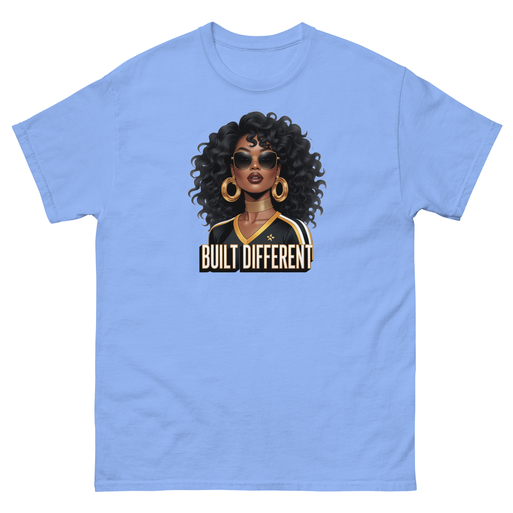 Command the spotlight. The “Built Different” tee celebrates boldness, self-worth, and unshakable style. Featuring a stunning digital illustration of a confident Black beauty in gold hoops, luxe accessories, and jet-black curls, this design was made for those who walk in power.