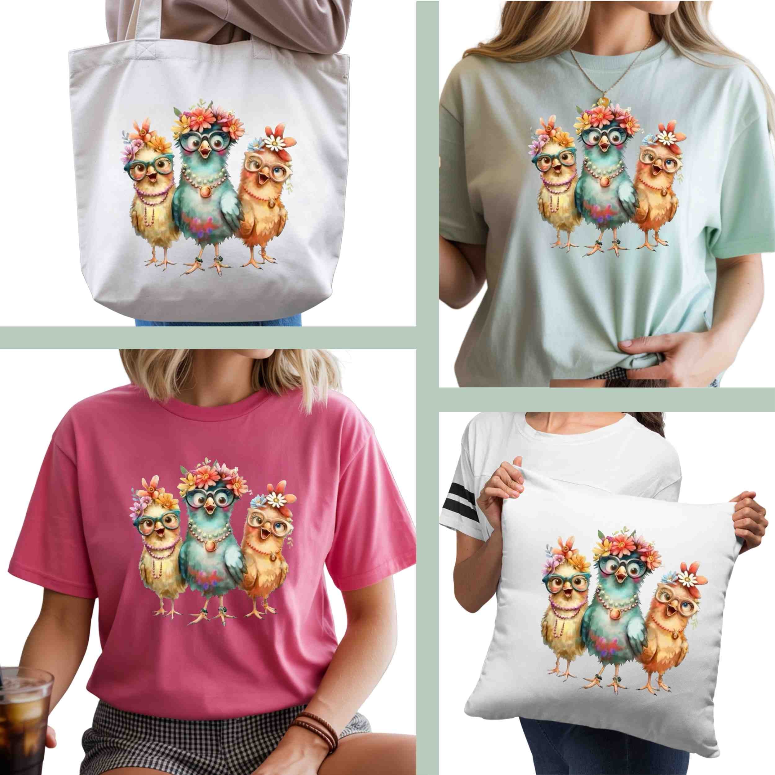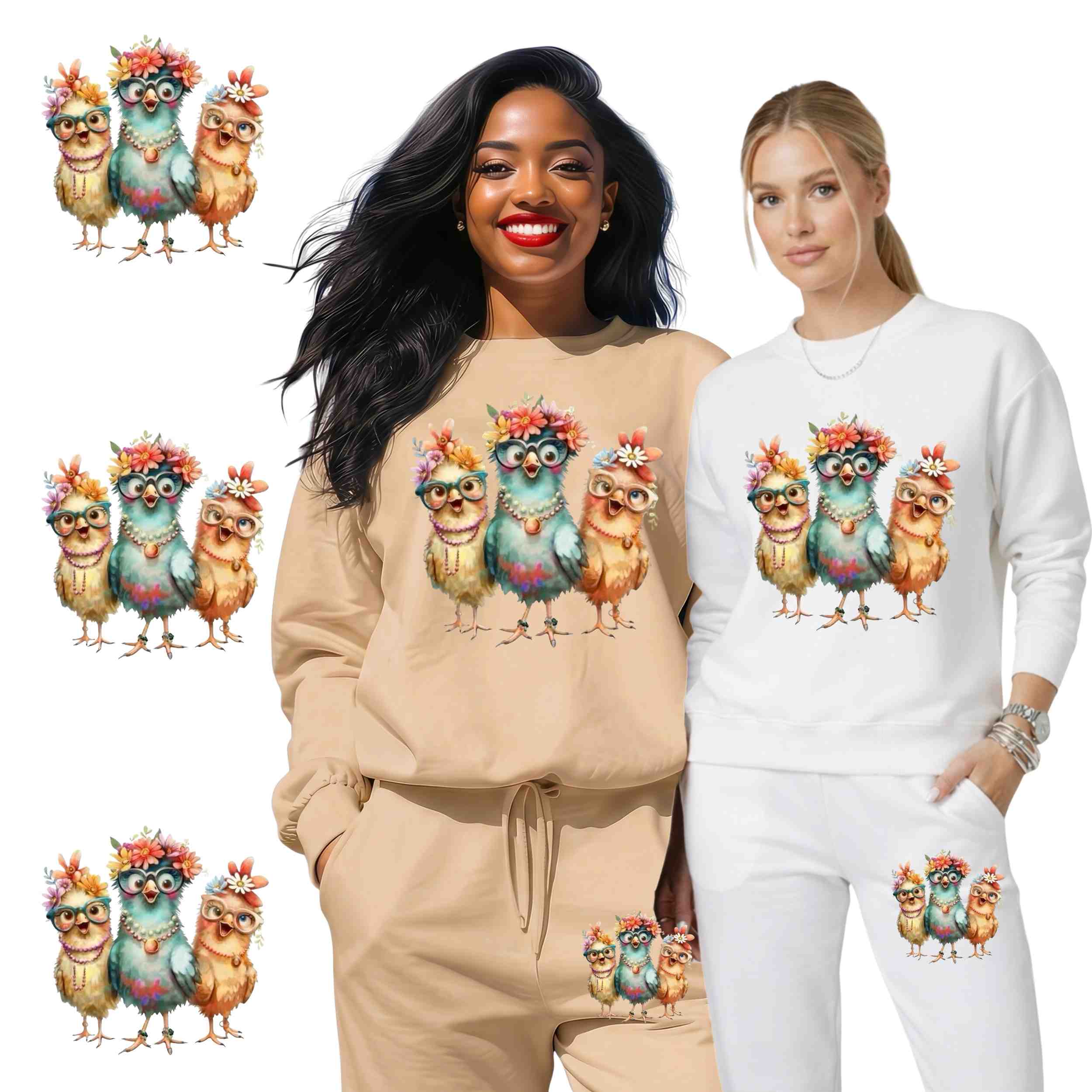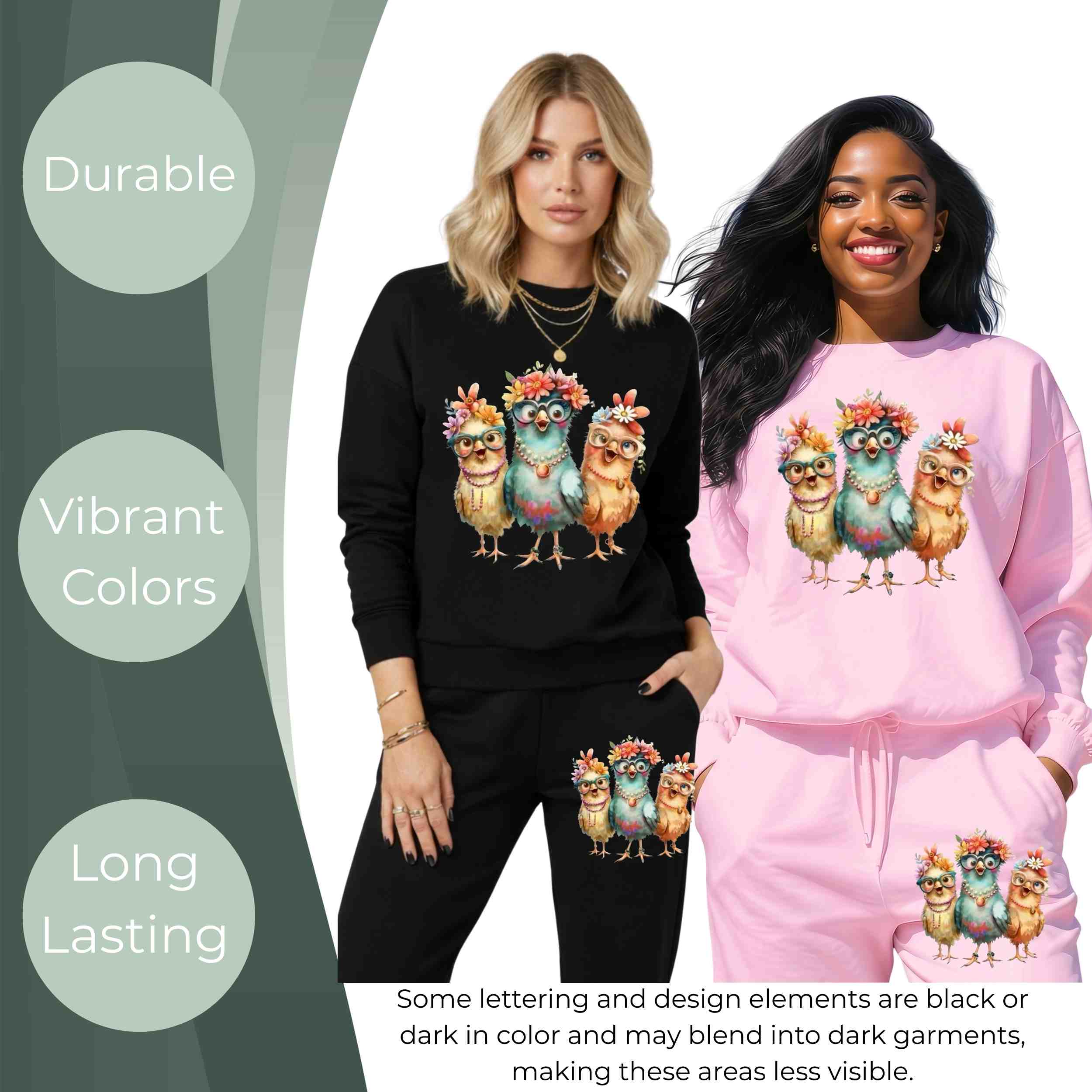 Floral Glasses Chick Trio 6-Pack DIY Bundle – 3 Eco-Solvent Iron-On Heat Transfers + 3 Sublimation Iron-On Heat Transfers, Ready to Press. Bonus: 4 Matching 2-Inch Stickers