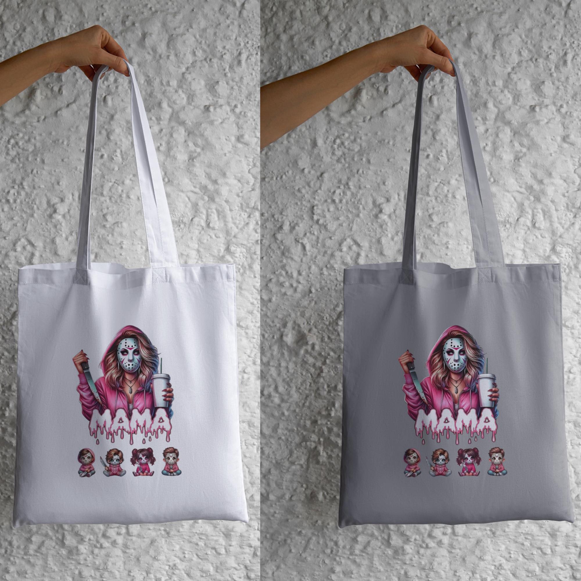 Bring a bold mix of horror and sass to your next creative project with our Horror Mama PNG digital design! This high-quality transparent PNG file features a fierce “Mama” character rocking a blood-splattered Jason-style mask, a pink hoodie, a drink in hand—and a don’t-mess-with-me vibe. Below her are four creepy-cute mini masked kids, making this design ideal for horror moms with personality!