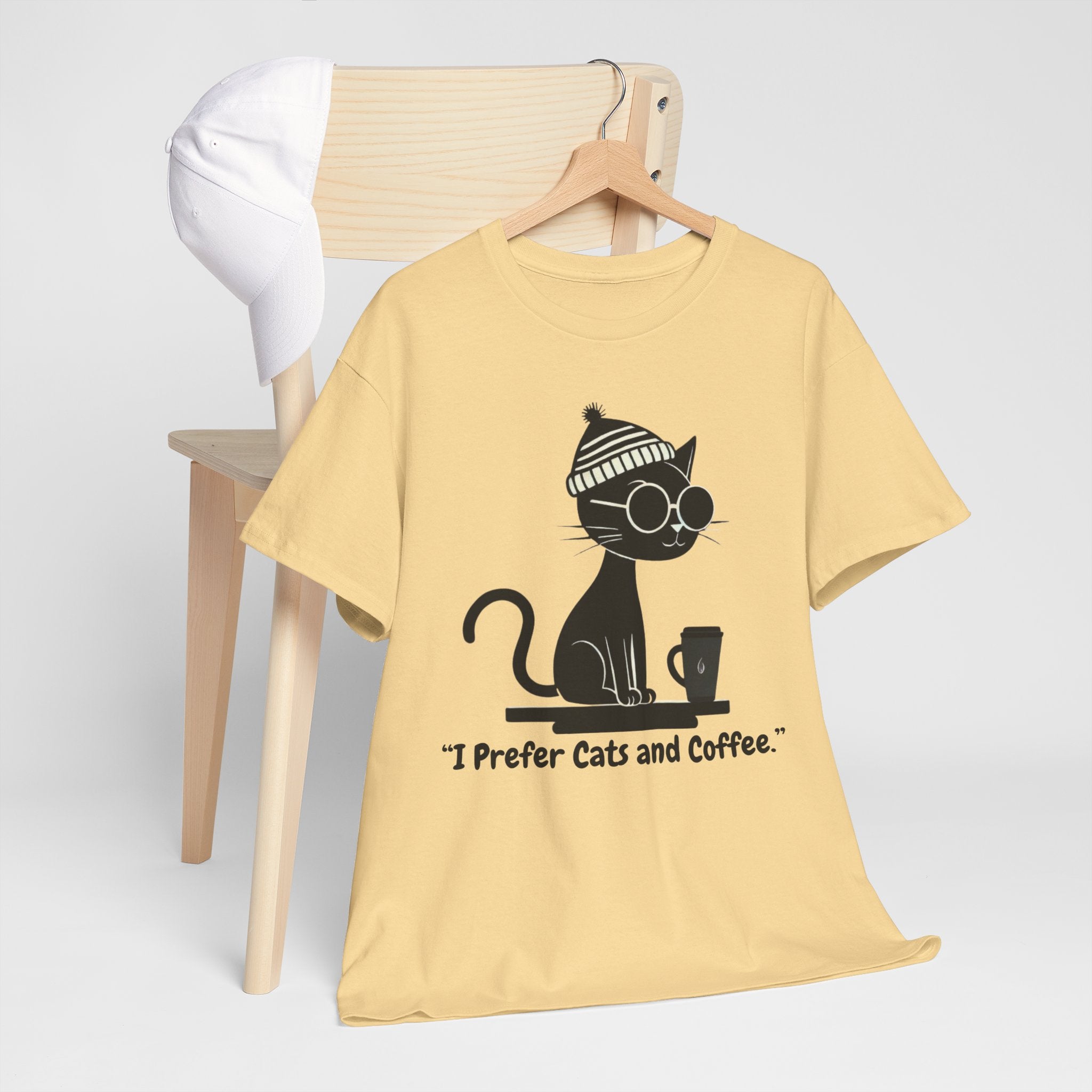 A soft, classic tee that quietly says what you already know: slow mornings, warm mugs, and the company of a purring friend. The front art — a minimalist, slightly vintage cat wearing a beanie and round glasses beside a steaming coffee cup with the line “I Prefer Cats and Coffee.” — feels like a private nod to cozy routines. The medium-weight cotton holds print detail cleanly while the crew neck and relaxed fit sit comfortably for reading on the porch, walking to your favorite café, or curling up with a cat in your lap. It’s an everyday shirt that settles into your life rather than shouting for attention.