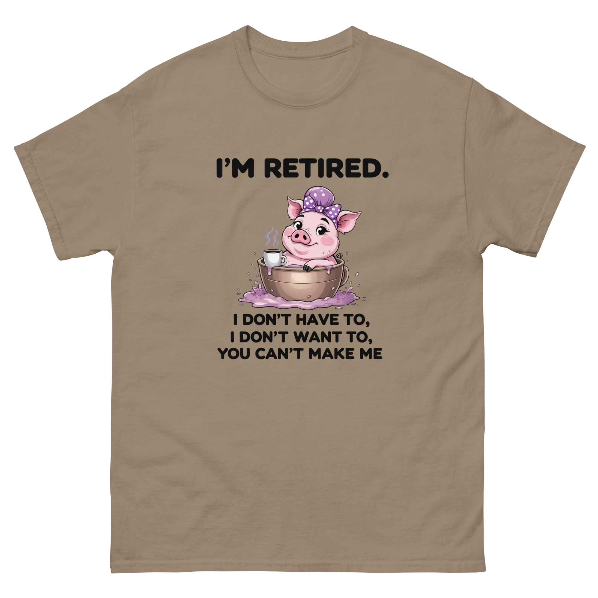 Featuring an adorable pink pig chilling #5 in a mug of cocoa, mud, or who-knows-what—this design says what every retired soul is really thinking: