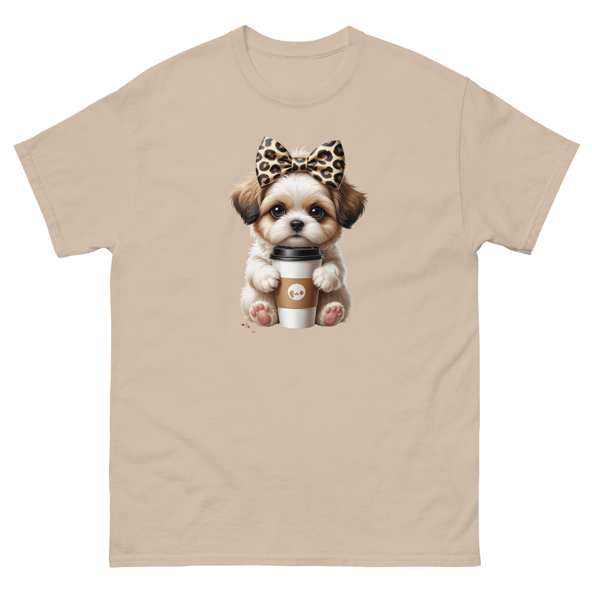 Bring a burst of cuteness to your wardrobe with our Adorable Leopard Bow Shih Tzu with Coffee T-Shirt! ☕🐾
