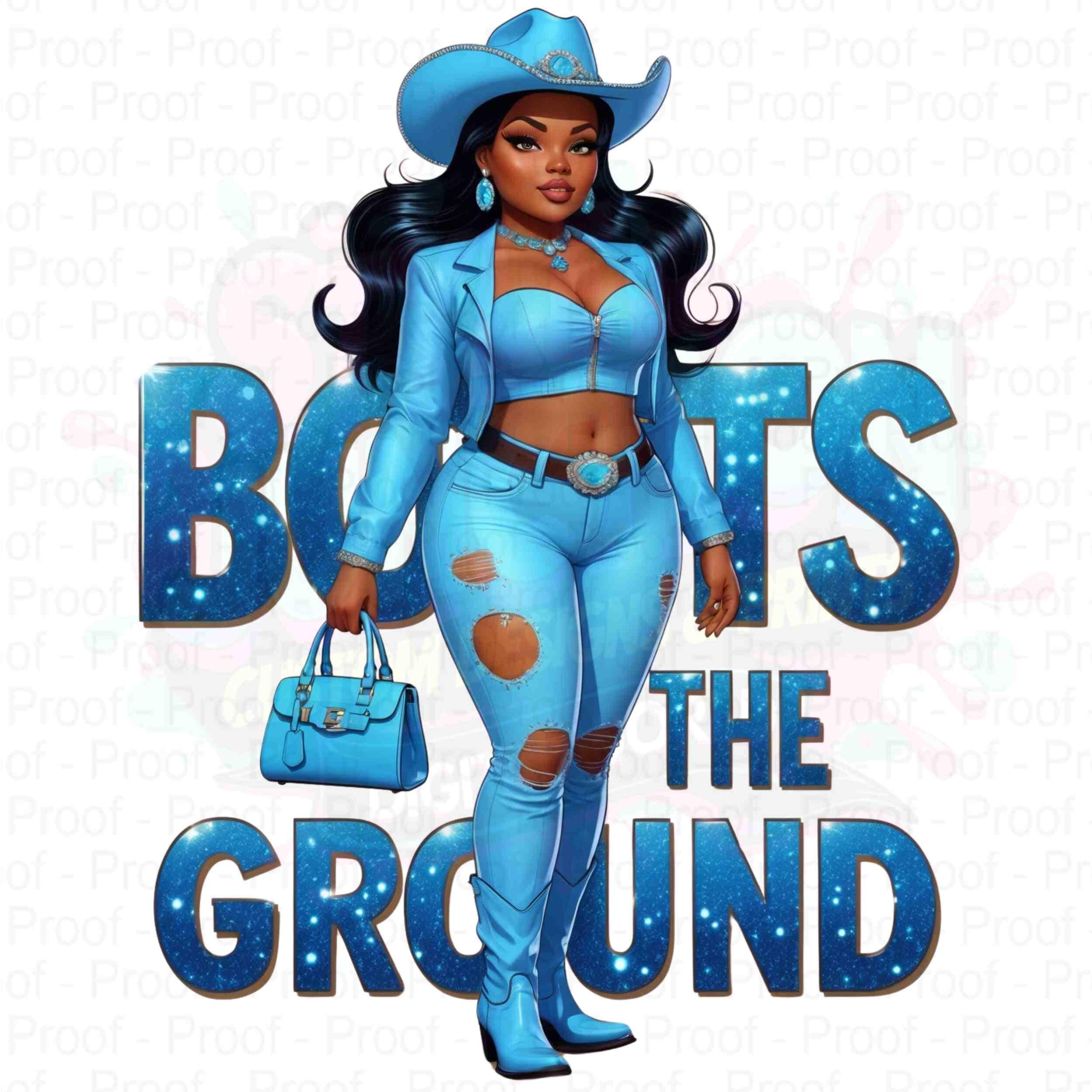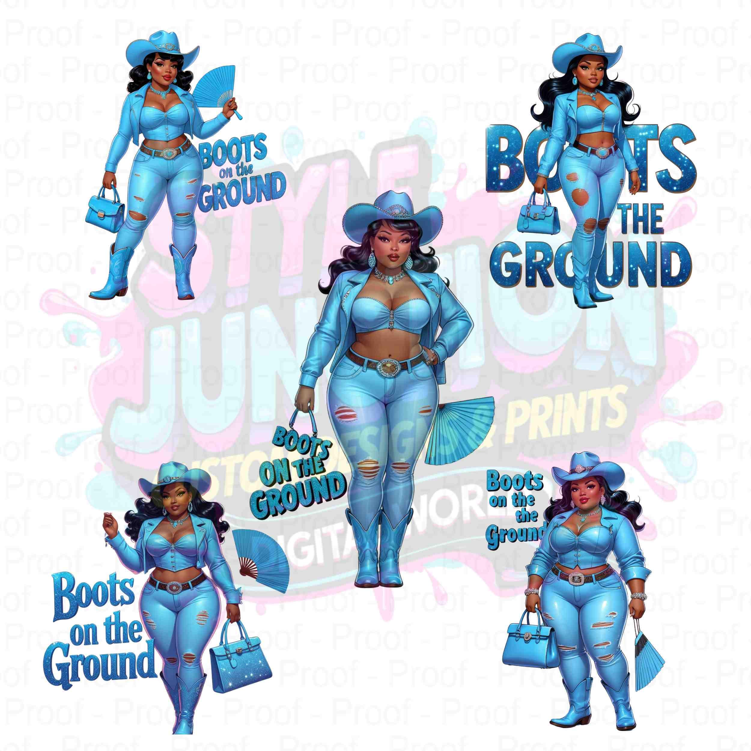 Introducing our bold and beautiful bestselling“Boots on the Ground” digital PNG collection featuring a thick, curvy African American cowgirl styled in an all light-blue outfit! This high-resolution (300 DPI) artwork includes 5 bestseller transparent PNG files showcasing a confident pinup cowgirl with glossy hair, glamorous accessories, and dazzling "Boots on the Ground" glitter-style text. Perfect for sublimation and printing on t-shirts, tote bags, mugs, posters, and more!