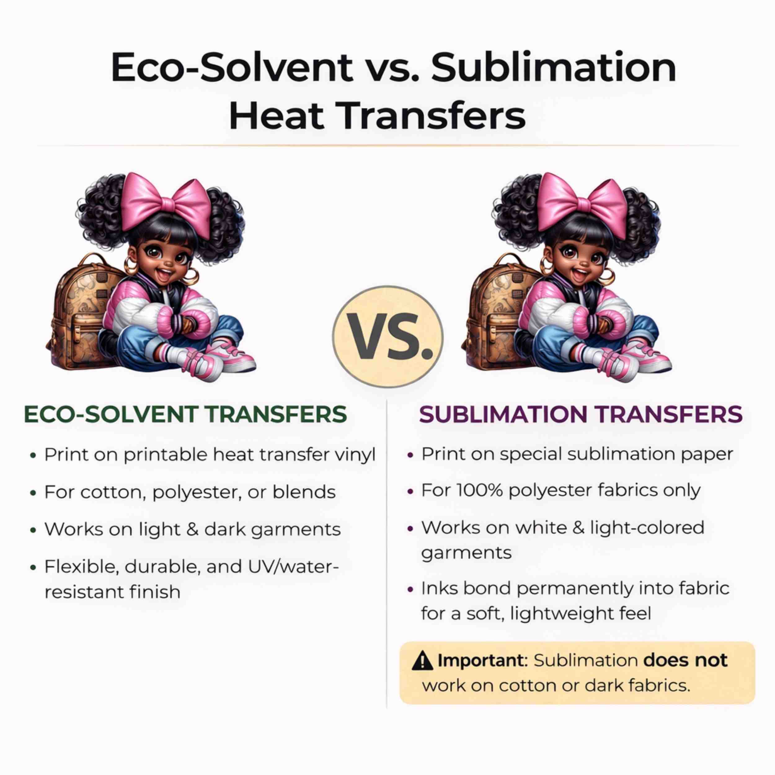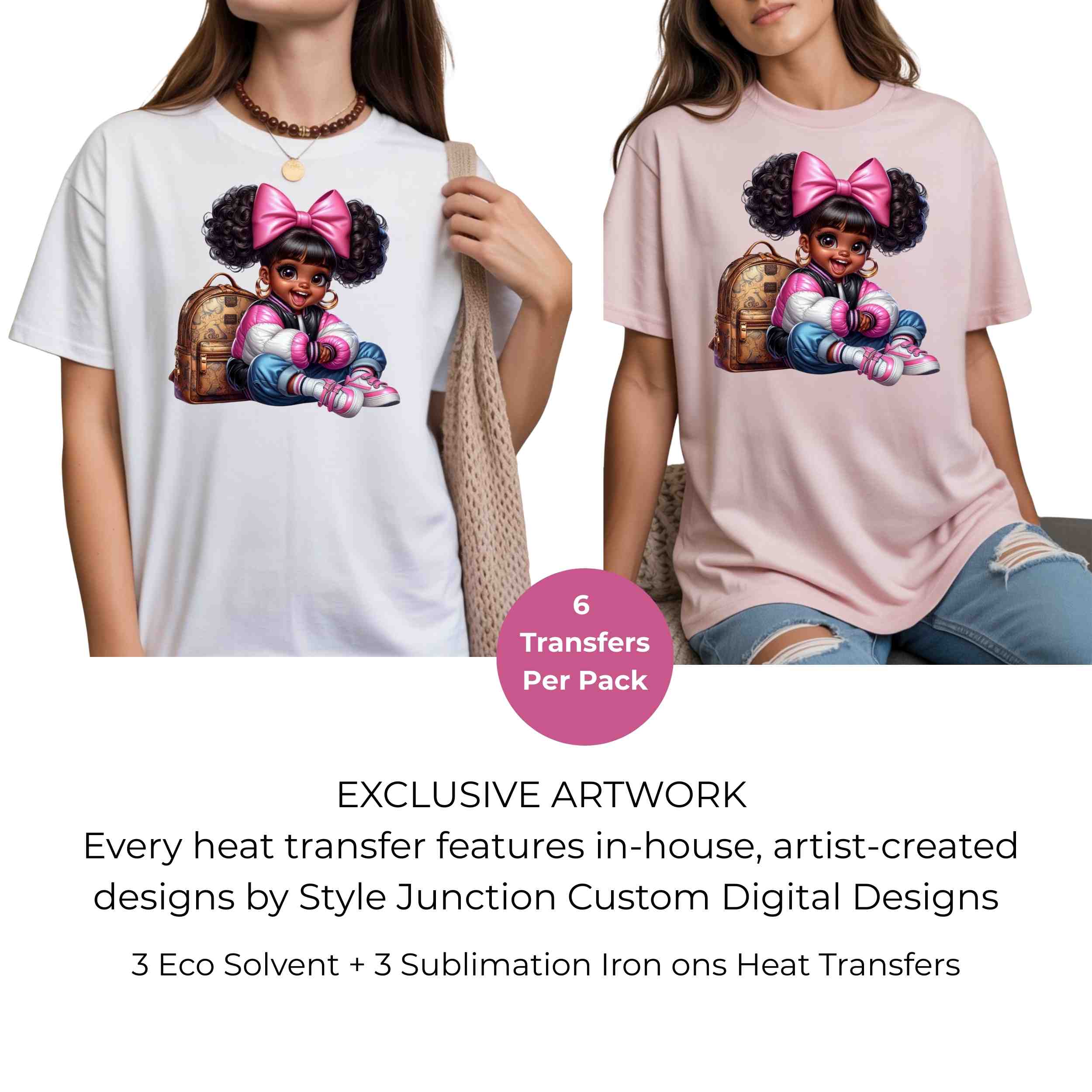 Little Miss Backpack Cutie 6-Pack – 3 Eco-Solvent + 3 Sublimation Iron on Transfers - Ready to Press (Iron on Transfers Only)