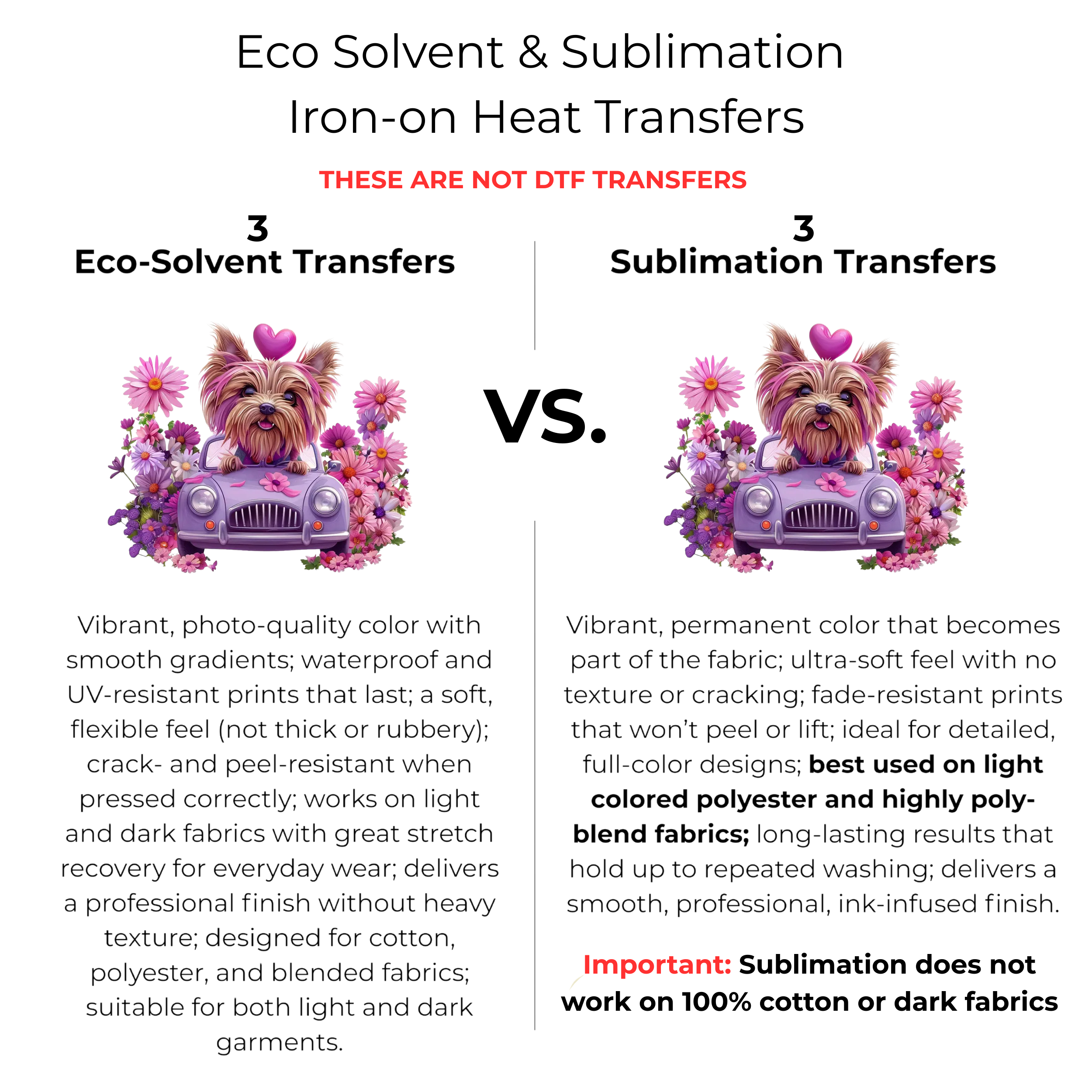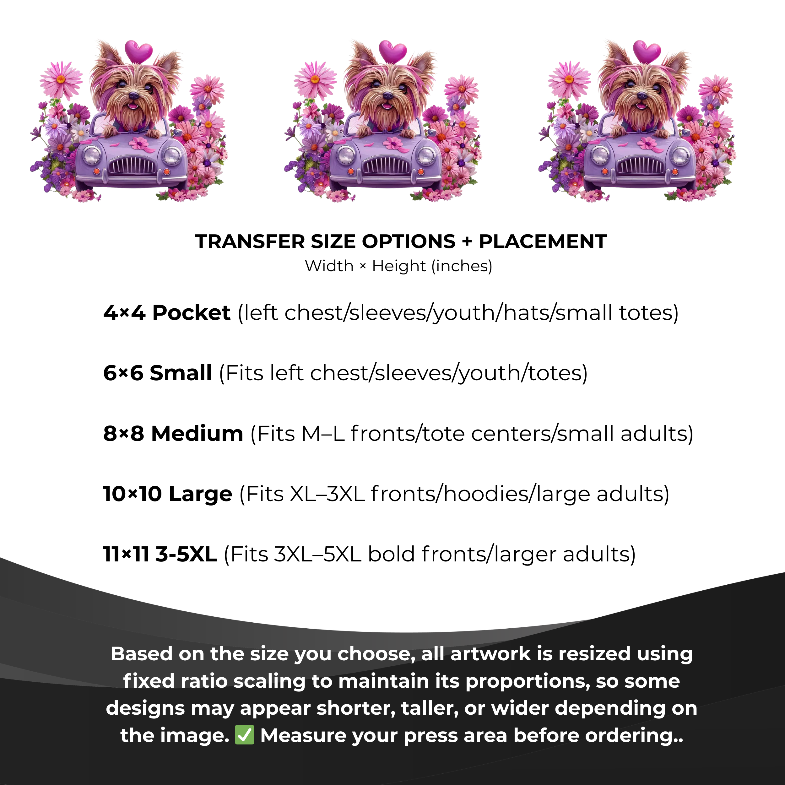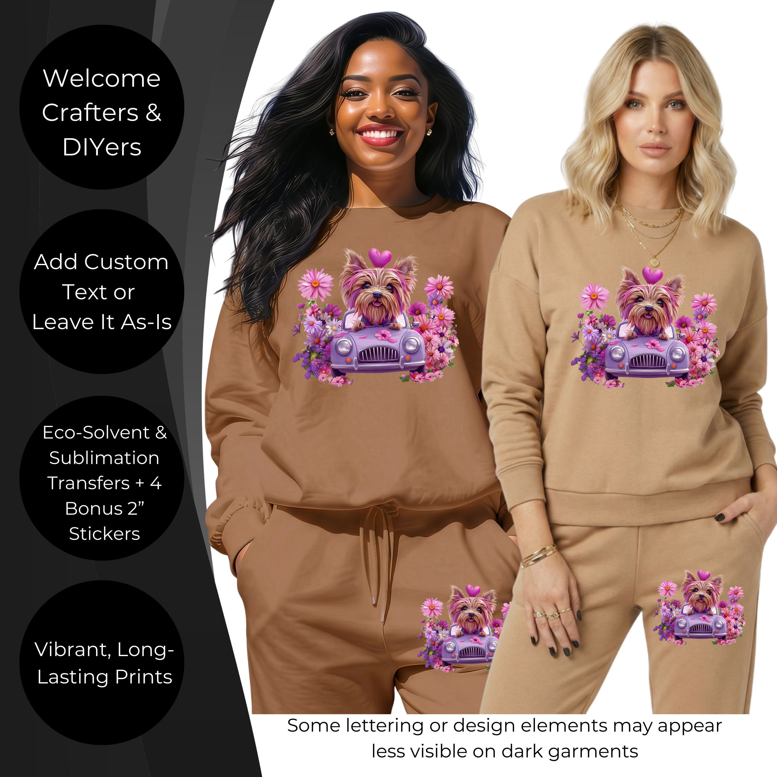 Petal Cruiser Yorkie 3 Eco-Solvent Iron-On Heat Transfers + 3 Sublimation Iron-On Heat Transfers, Ready to Press. Bonus: 4 Matching 2-Inch Stickers