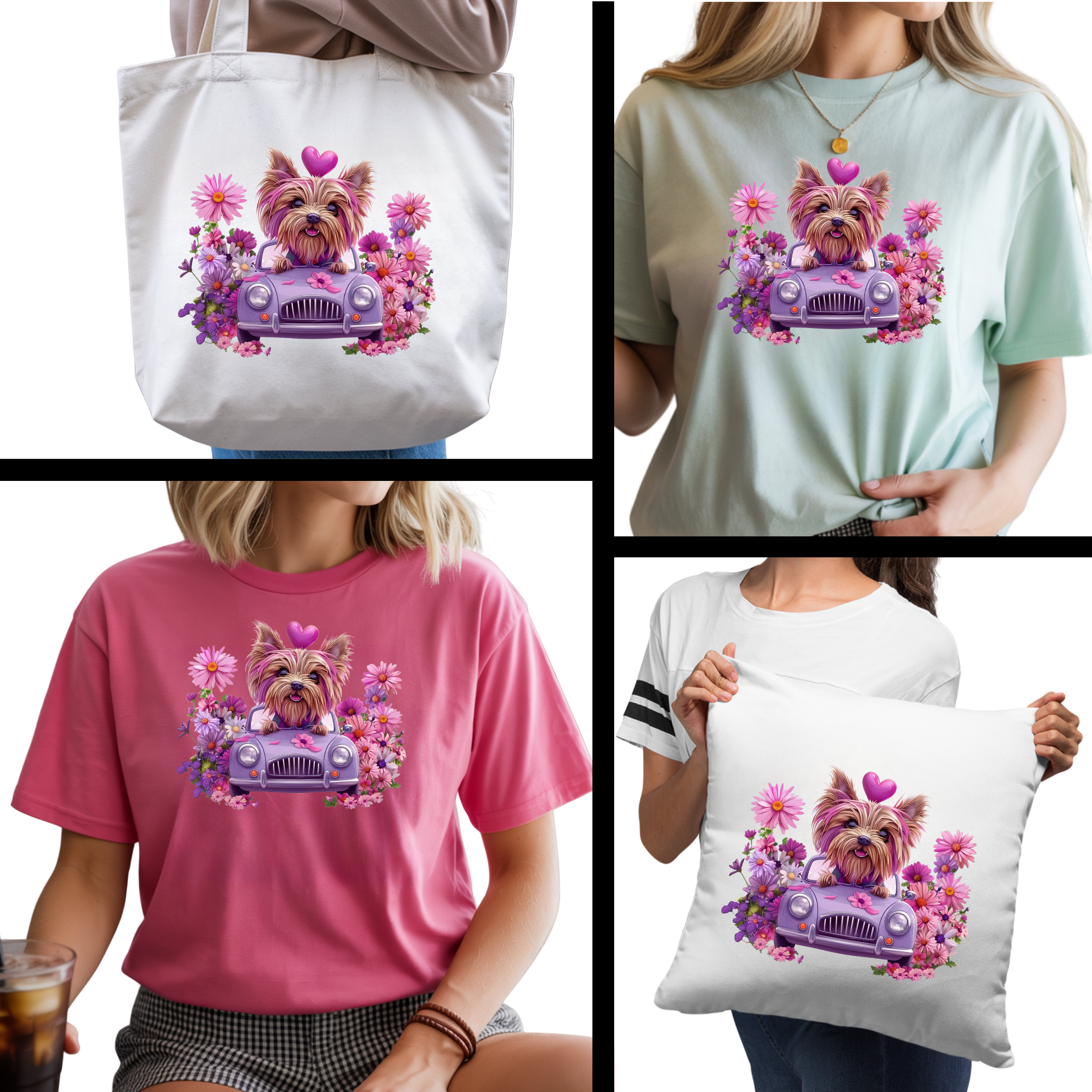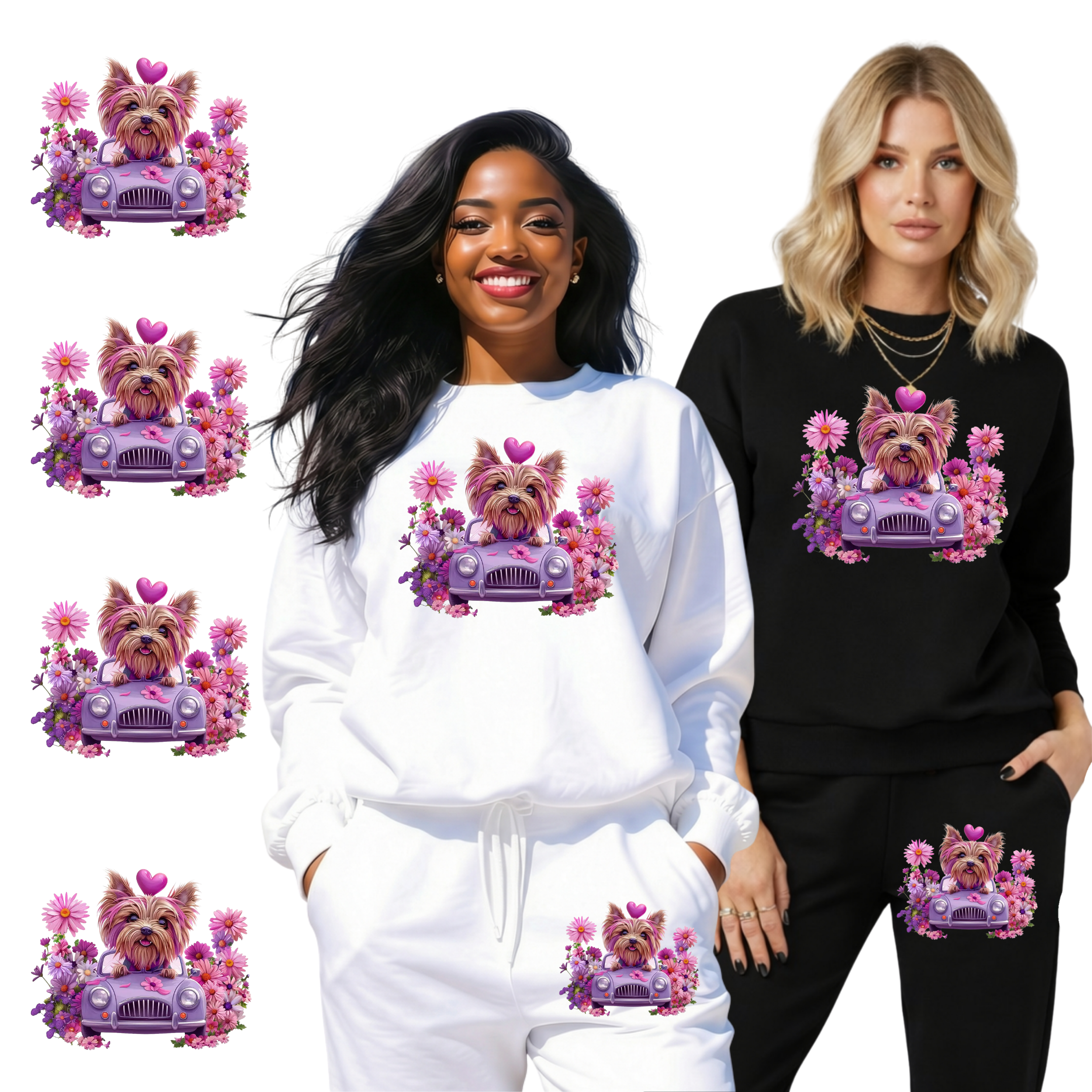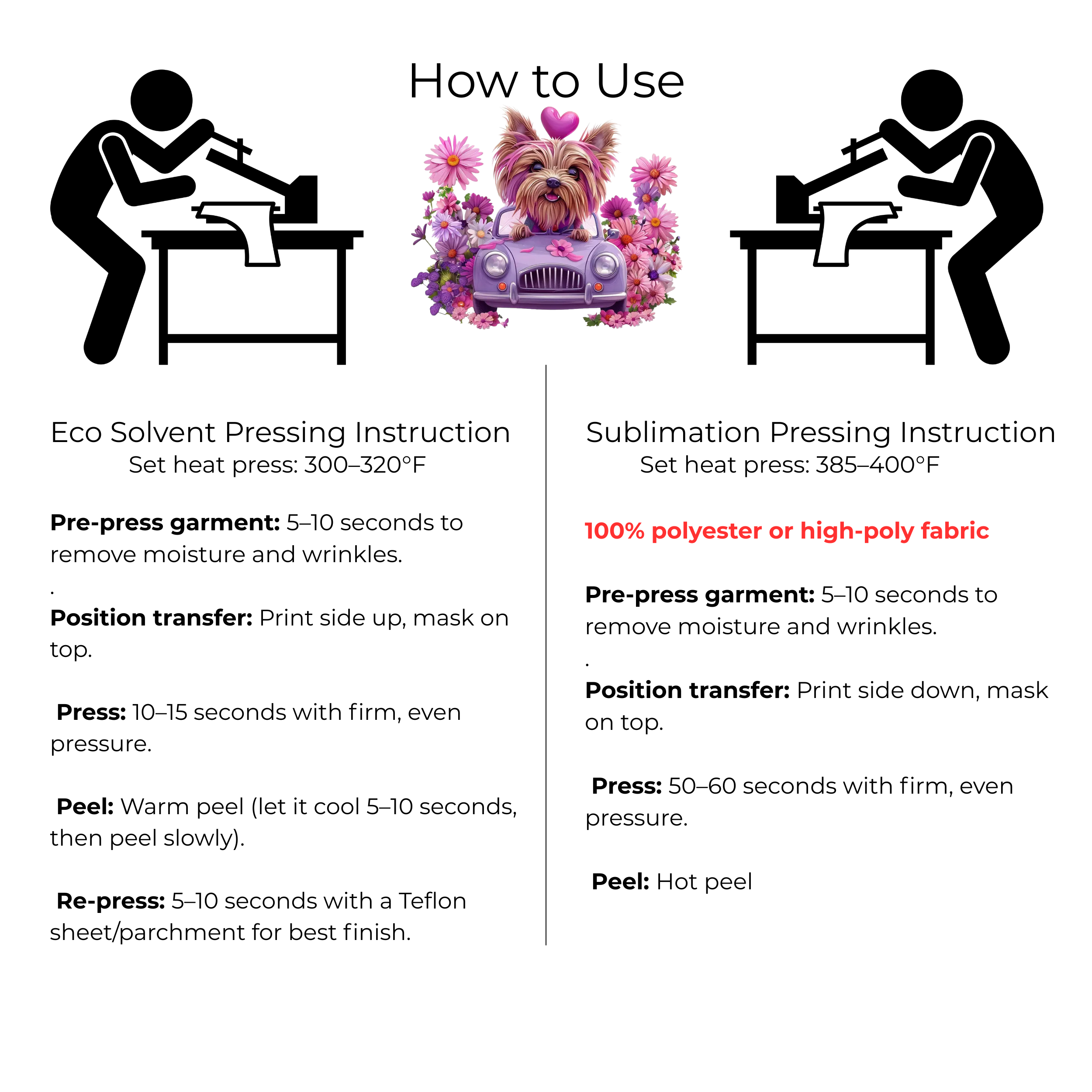 Petal Cruiser Yorkie 3 Eco-Solvent Iron-On Heat Transfers + 3 Sublimation Iron-On Heat Transfers, Ready to Press. Bonus: 4 Matching 2-Inch Stickers