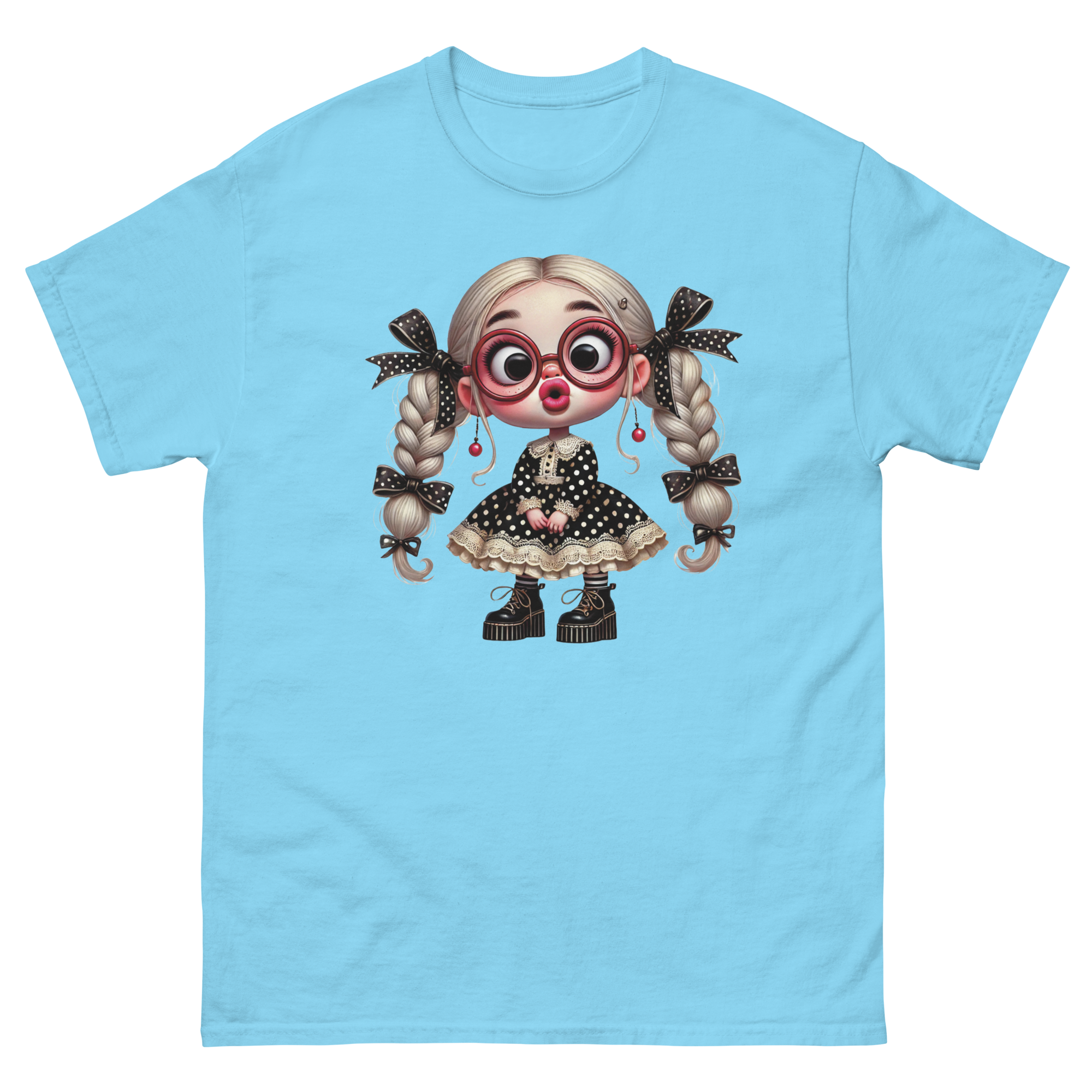 🎀 Embrace playful vintage vibes with our Cute Polka Dot Girl T-Shirt! Featuring a sweet character with braided pigtails, giant round glasses, a classic black polka dot dress, and chunky platform boots, this design brings retro charm with a bold modern twist. Whether you're dressing it up or down, this tee adds instant cuteness and standout style to any outfit! ✨