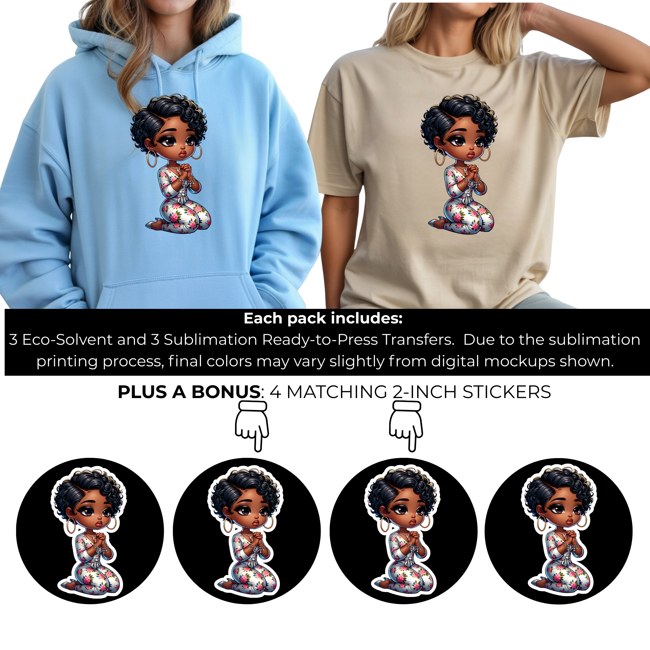 Prayer Blossom Cutie 6-Pack Crafter’s & DIY Bundle – 3 Eco-Solvent + 3 Sublimation Ready-to-Press Iron-On Heat Transfers for T-Shirts, Tote Bags & More, + Bonus 4 Matching 2-Inch Stickers