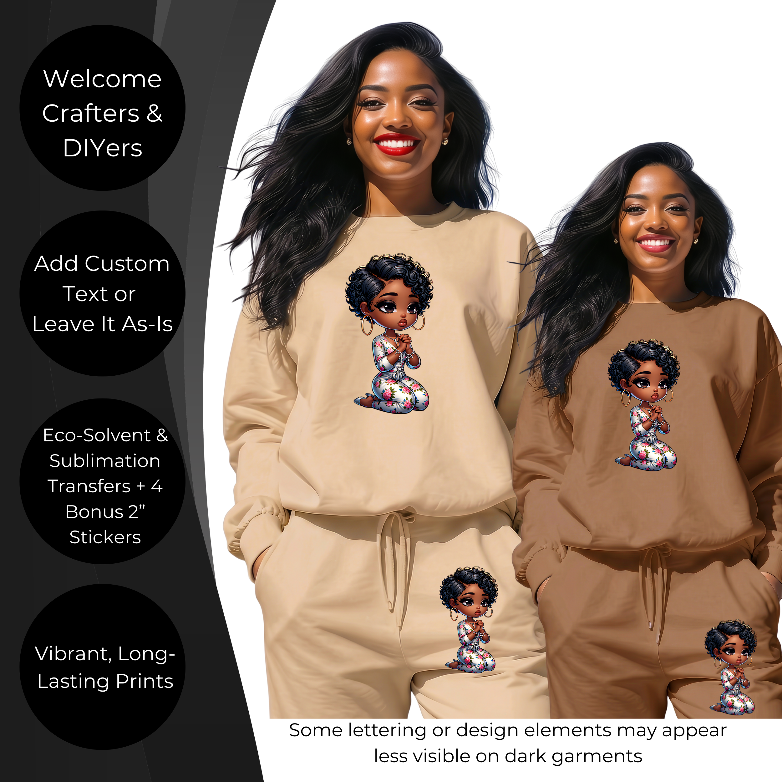 Some lettering or design elements may contain black or dark tones. When applied to dark garments, these areas may blend in and appear less visible.
