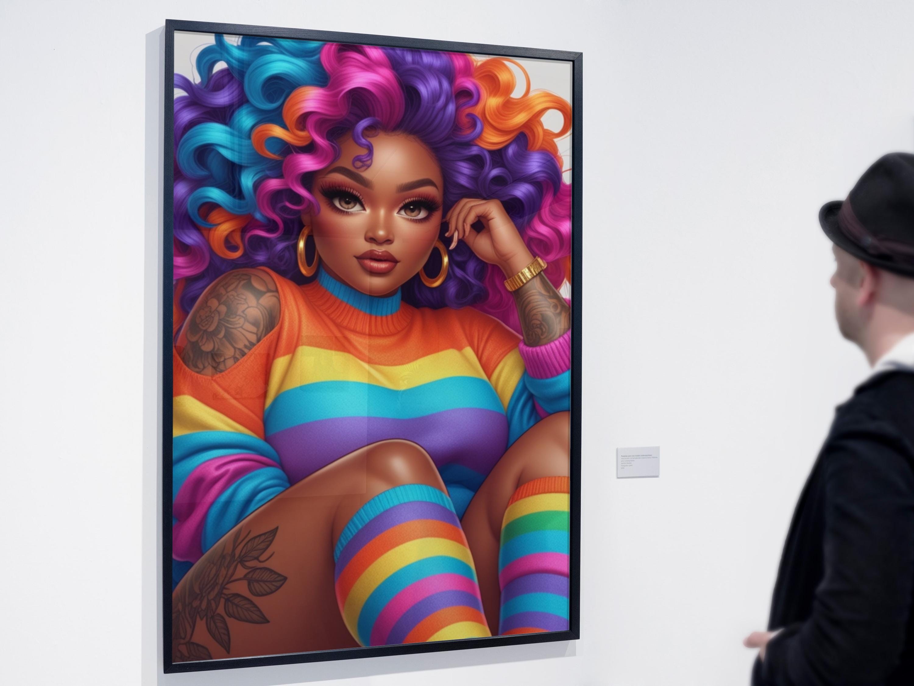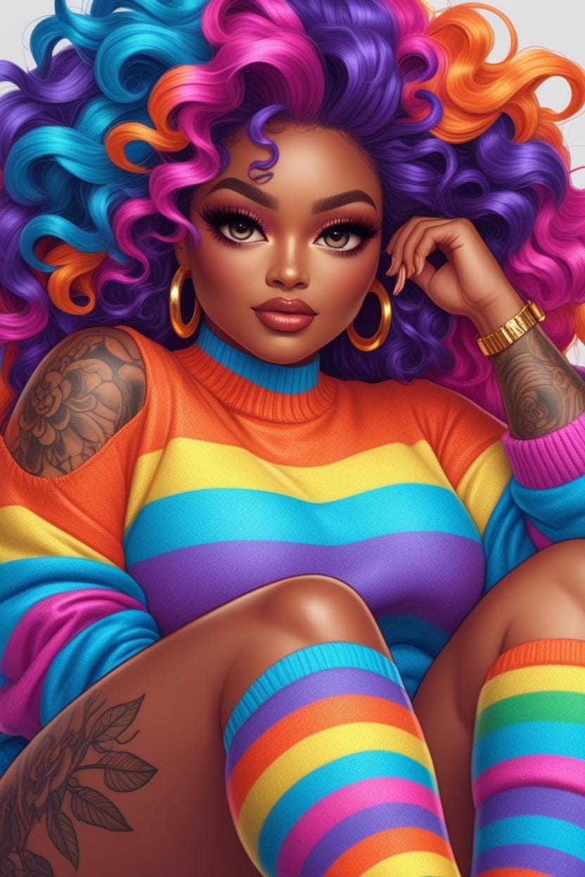 Bring the energy of bold pride, empowerment, and fierce style into your creative space with this stunning digital wall art print of a confident, curly-haired queen dressed in head-to-toe rainbow vibes. From her radiant multi-colored curls to her luxe gold accessories and cozy rainbow-striped outfit, this art radiates individuality and fashion-forward joy. Whether youre decorating your home, creating apparel, or jazzing up your business brandingthis image delivers impact and style.