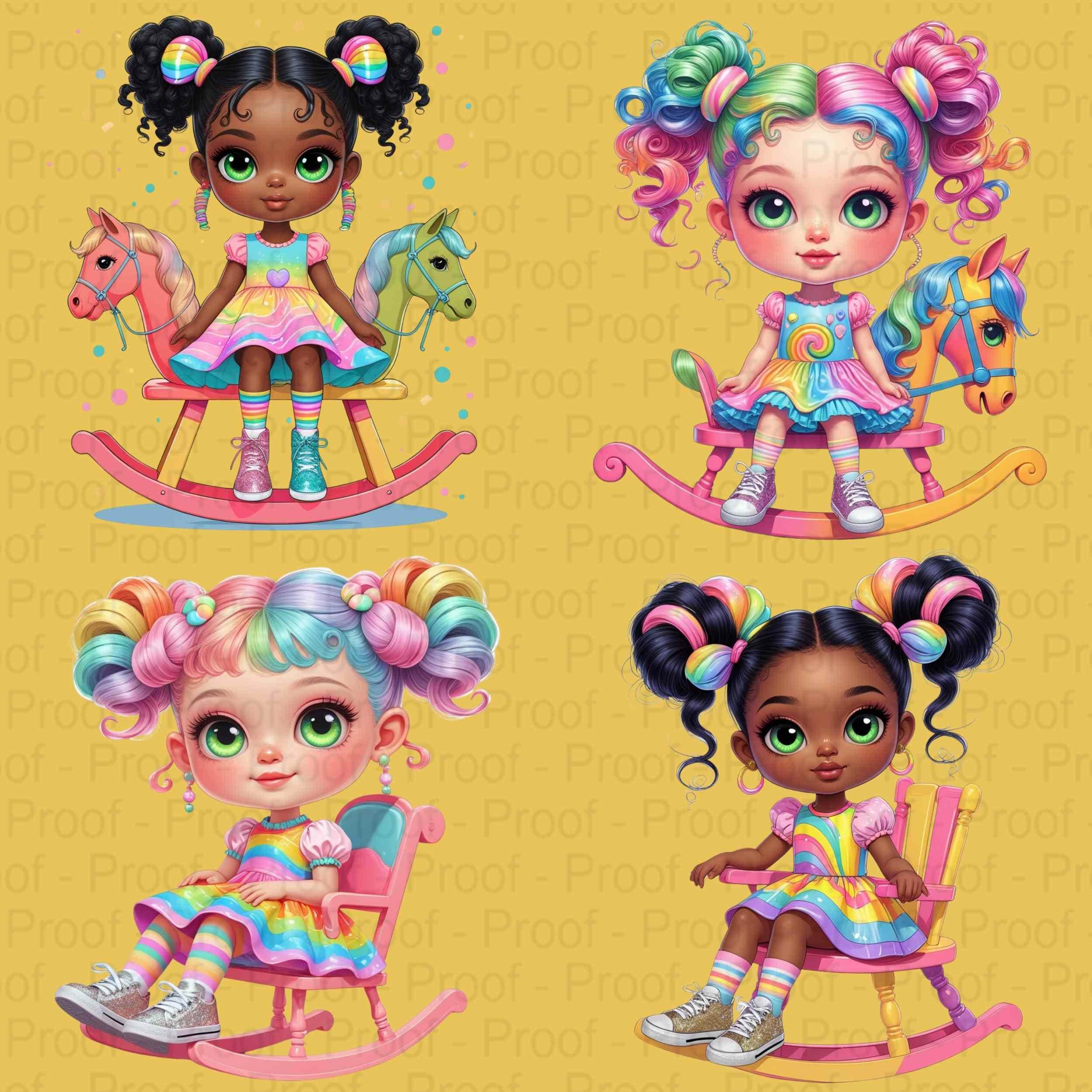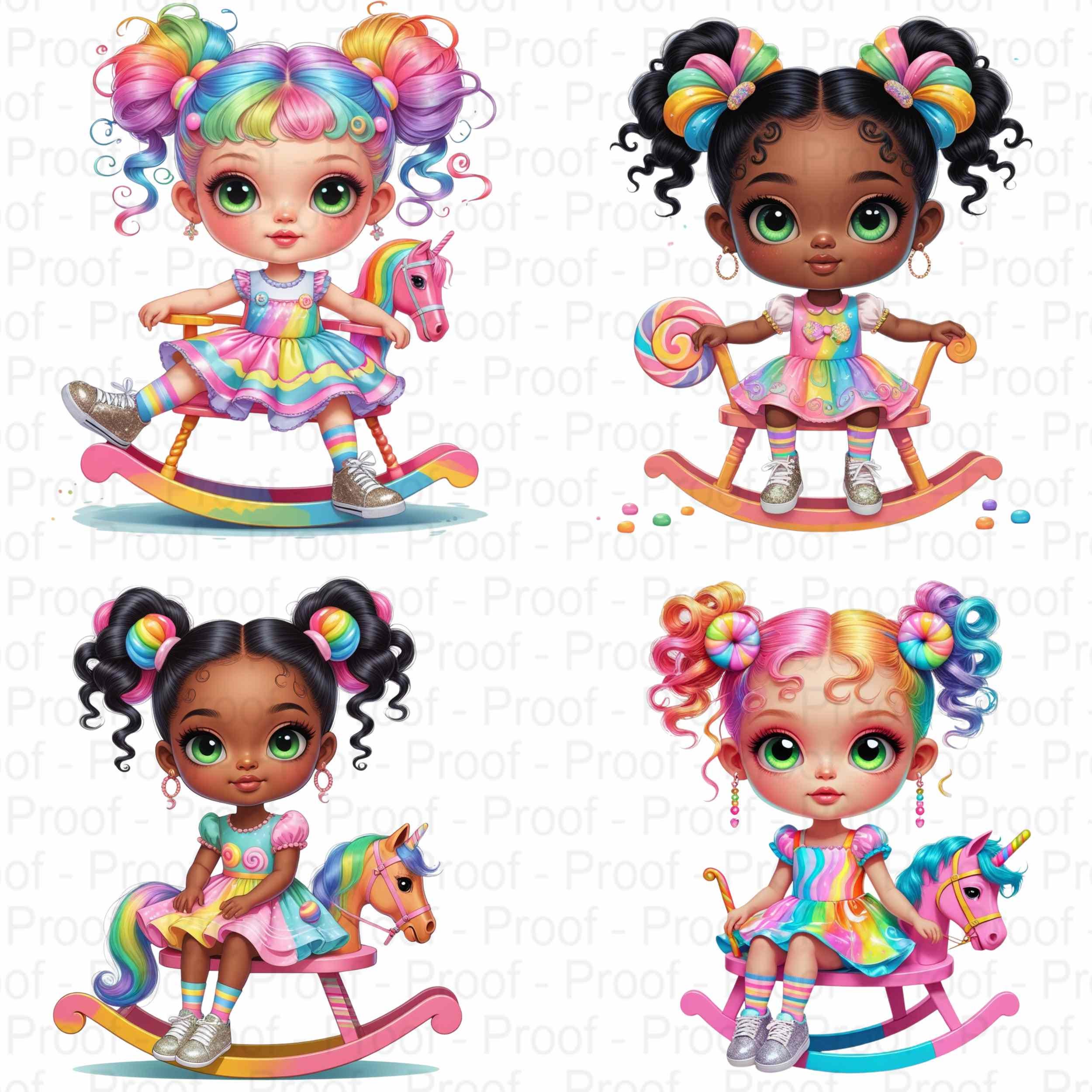 Brighten your world with this vibrant Candy Pop Fantasy-themed bundle featuring 8 high-resolution transparent PNG files of adorable girls on colorful rocking horses! Each image bursts with personalitygiant sparkling eyes, rainbow pigtails, pastel dresses, glitter sneakers, and playful candy elements. These files are perfect for sublimation and print-on-demand projects and are uniquely crafted for Style Junction only.
