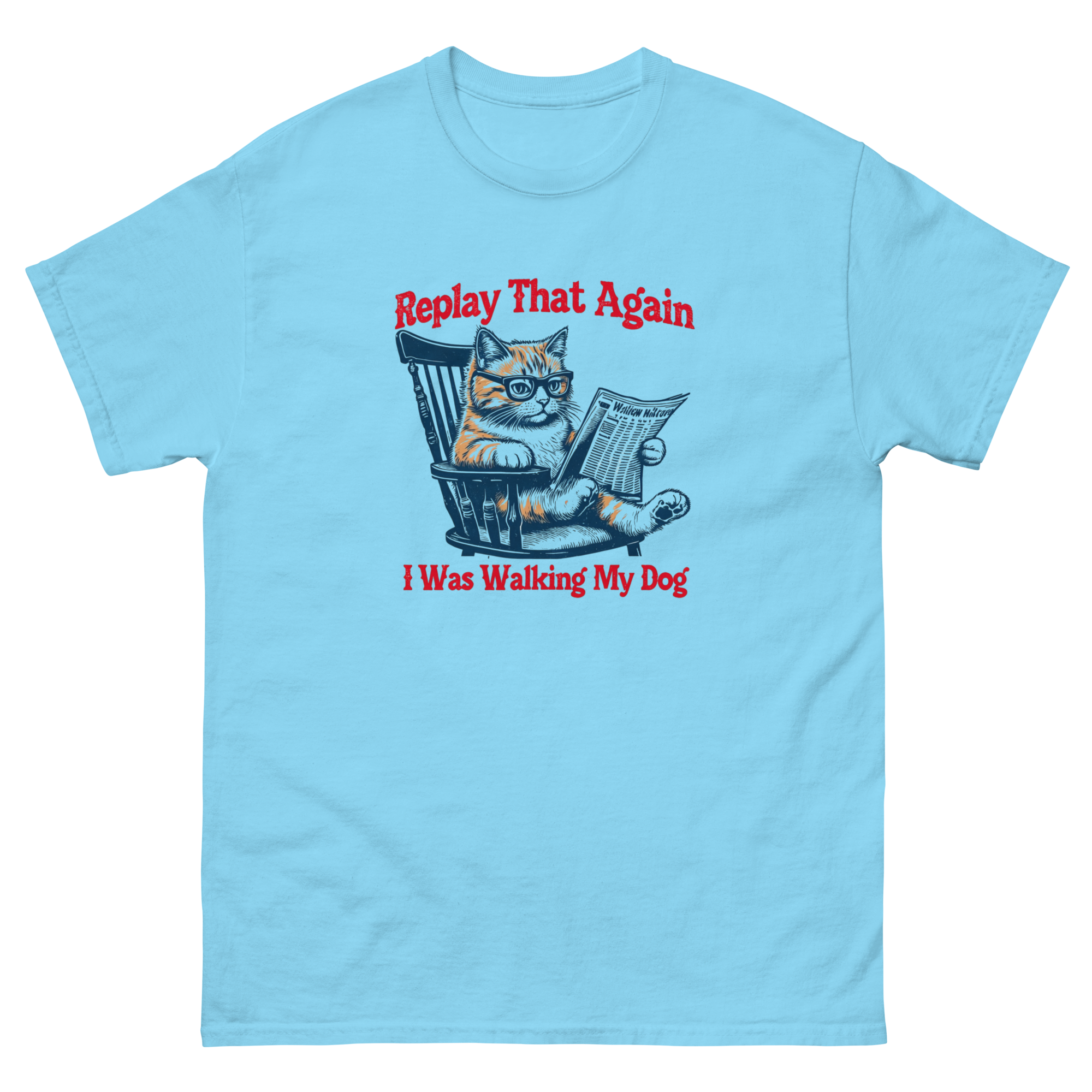 ✨ Add a little laughter to your wardrobe with this "Replay That Again – I Was Walking My Dog" funny cat tee! Featuring a stylish cat reading the newspaper, this retro-inspired design is perfect for anyone who loves humor, comfort, and unique streetwear.