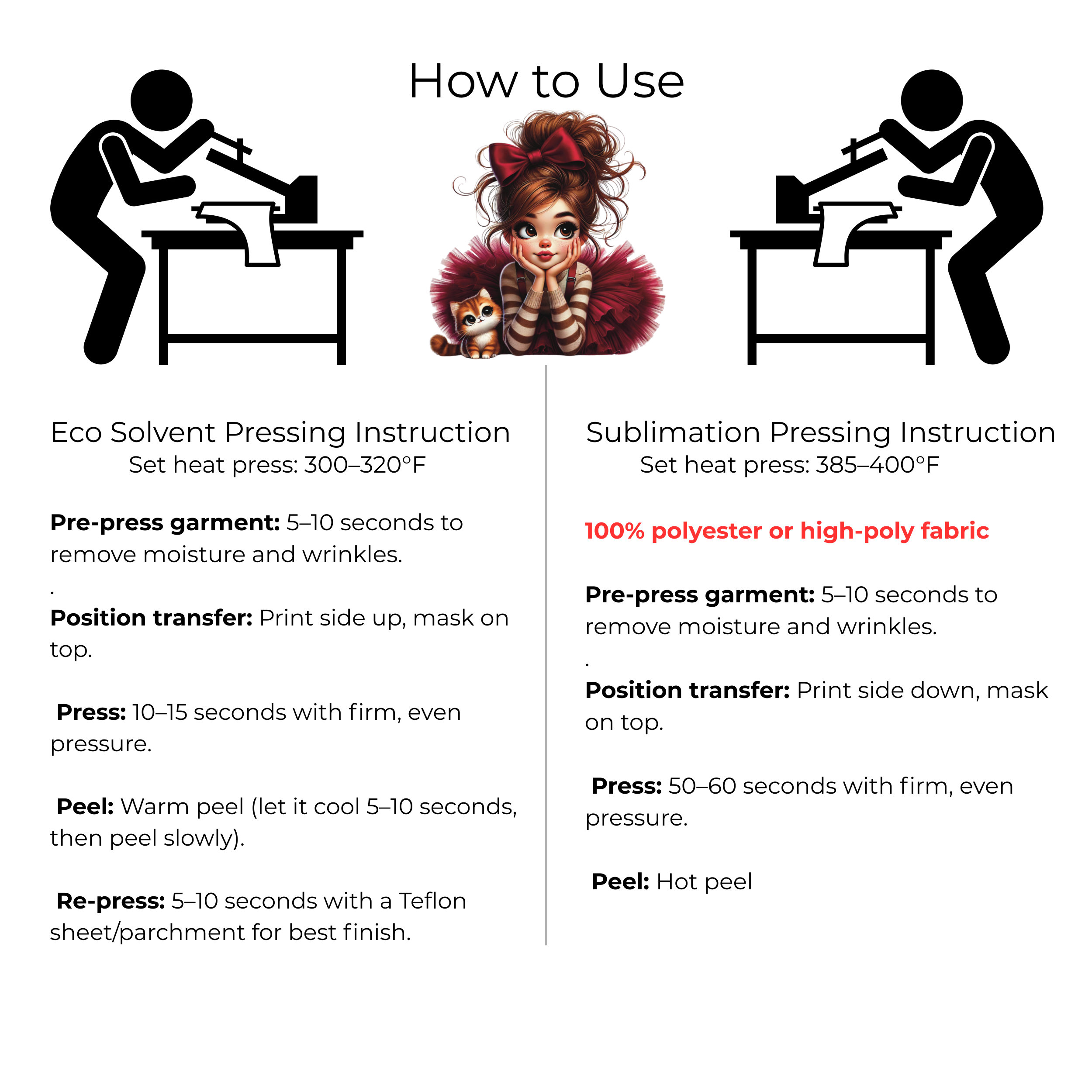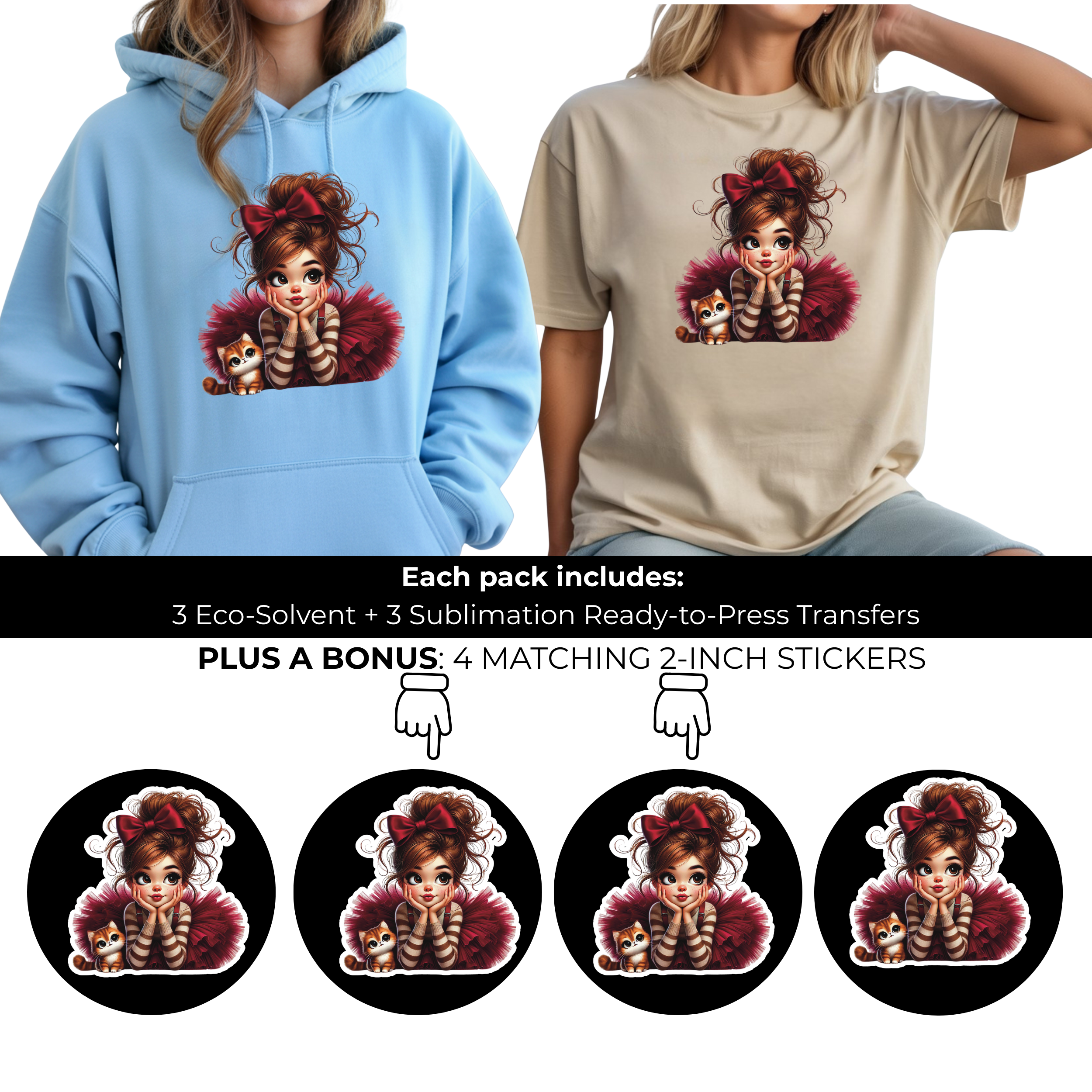 Scarlet Daydream Darling 3 Eco-Solvent Iron-On Heat Transfers + 3 Sublimation Iron-On Heat Transfers, Ready to Press. Bonus: 4 Matching 2-Inch Stickers