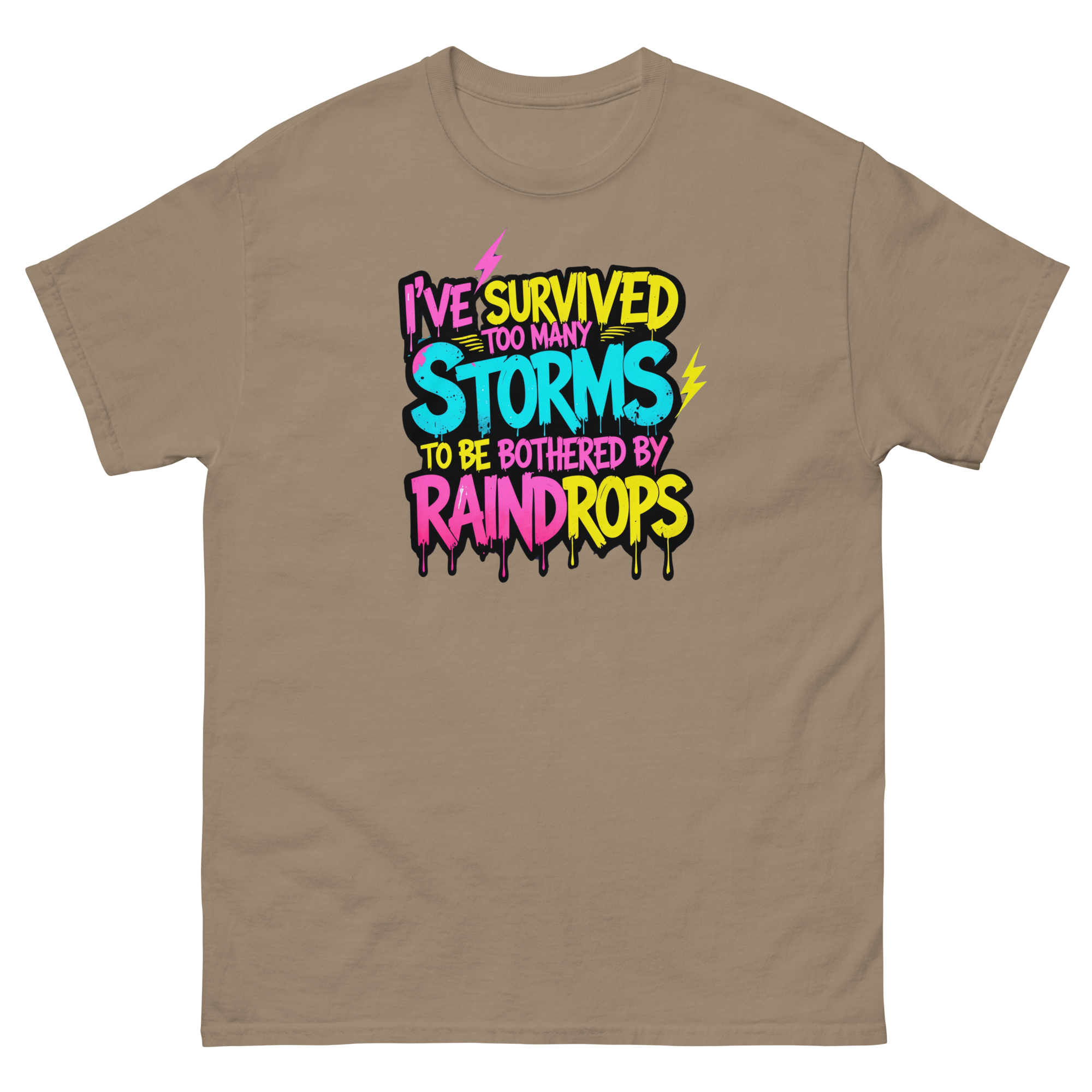 🎨 Vibrant “Survived the Storms” text in eye-catching neon
