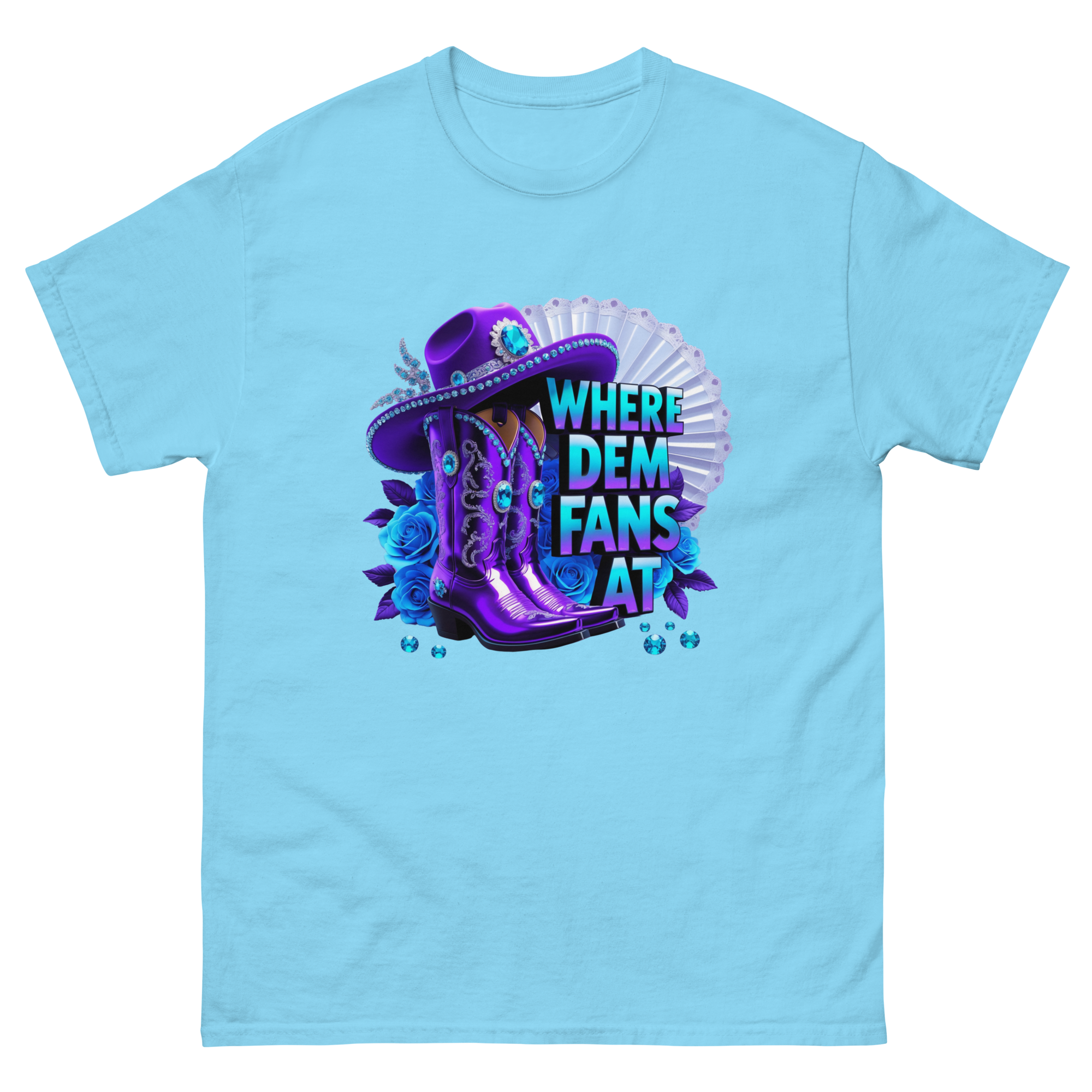 Put your bold energy on full display in this “Where Dem Fans At” tee—made for the glam cowgirl who knows how to bring heat and sparkle to any room. Whether you’re flipping a lace fan or stomping in boots, this tee says you didn’t come to play—you came to SLAY.