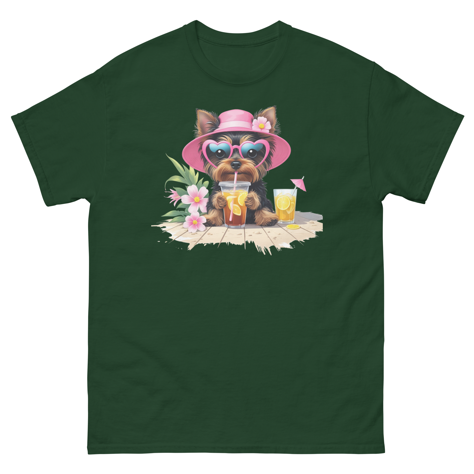 Sip into summer with this vibrant iced tea Yorkie graphic tee 🍹🐾 Featuring a playful watercolor-style pup in pink shades and a wide-brim hat, surrounded by bright florals and refreshing drinks. This shirt brings charm and bold personality to your wardrobe, perfect for creative souls and iced tea lovers alike.